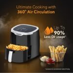 - 360° Rapid hot air circulation technology. It quickly disperses heated air in all directions. It also evenly cooks the food with 90% less oil , preserving the crispy exterior texture