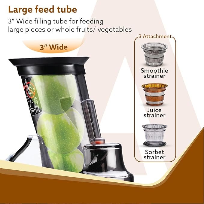 - Large 74mm Feeding Tube I Can process whole fruits like orange & apple.