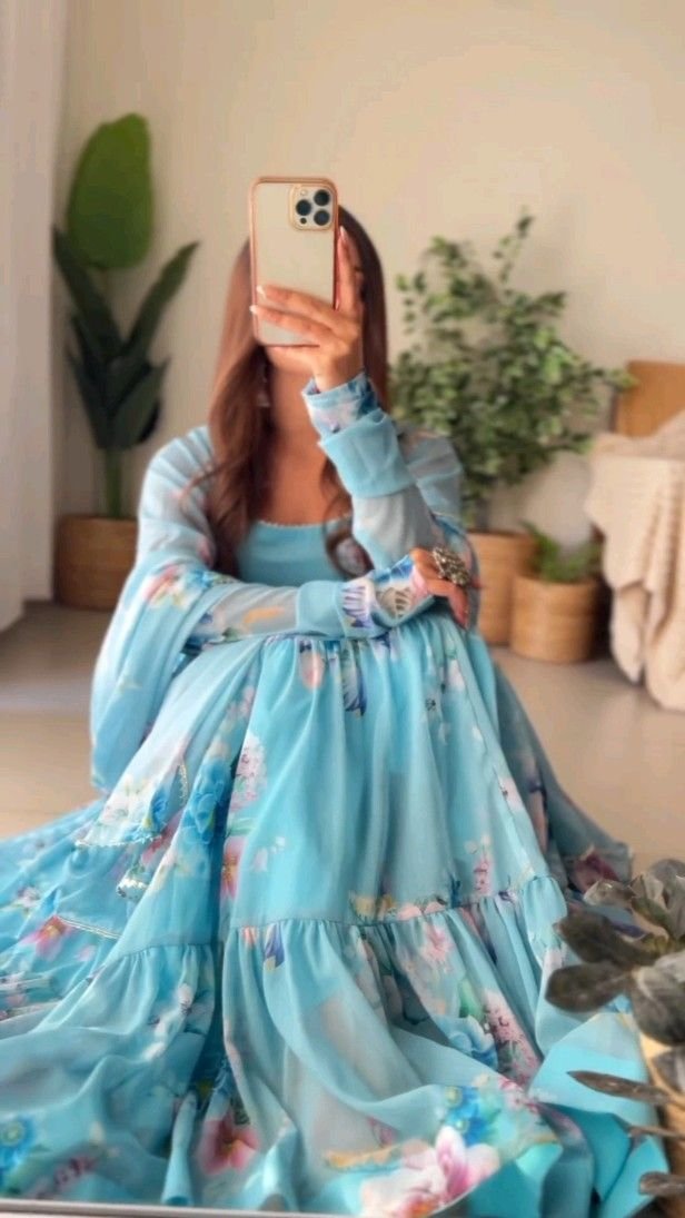 Step into effortless elegance with this beautiful sky blue floral printed tiered dress set with shrug. Designed with soft, flowy fabric and delicate floral patterns, this outfit brings a perfect blend of comfort and style. The sleeveless inner dress features a layered tiered design that adds volume and grace, while the matching long shrug enhances the overall look with a chic and modern touch. Ideal for casual outings, festive gatherings, and day events, this outfit offers a refreshing and feminine appeal.