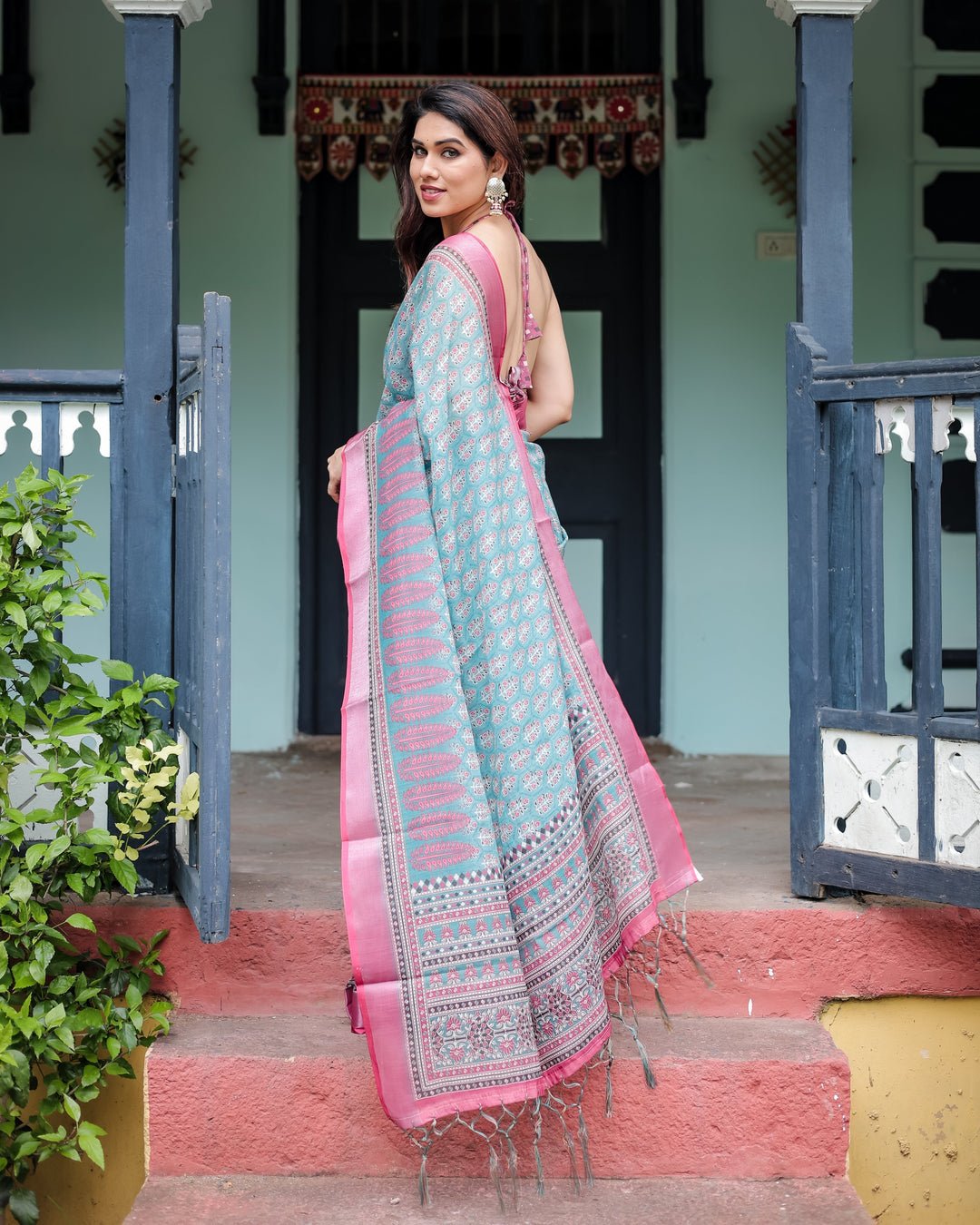 Aqua Blue Pure Cotton Linen Saree with Pink Border, Floral Motifs, and Tassel Detailing | Crown Fashion