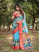 Be the first to review “Aqua Blue Tussar Silk Saree with Vibrant Nature-Inspired Prints and Red Zari Border | Crown Fashion”