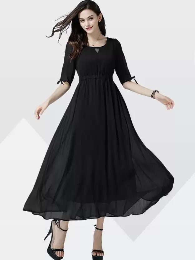 Product DescriptionKeep it simple yet stylish with this elegant black chiffon tunic dress, designed for effortless charm and comfort. The flowy silhouette enhances movement, while the lightweight fabric ensures a breezy feel. Perfect for casual outings, evening gatherings, or minimal party looks, this dress is a must-have wardrobe essential. About ProductThis western tunic dress is ideal for women who love modern, easy-to-wear fashion. The timeless black color adds versatility, making it suitable for both casual and semi-formal occasions. Key Features