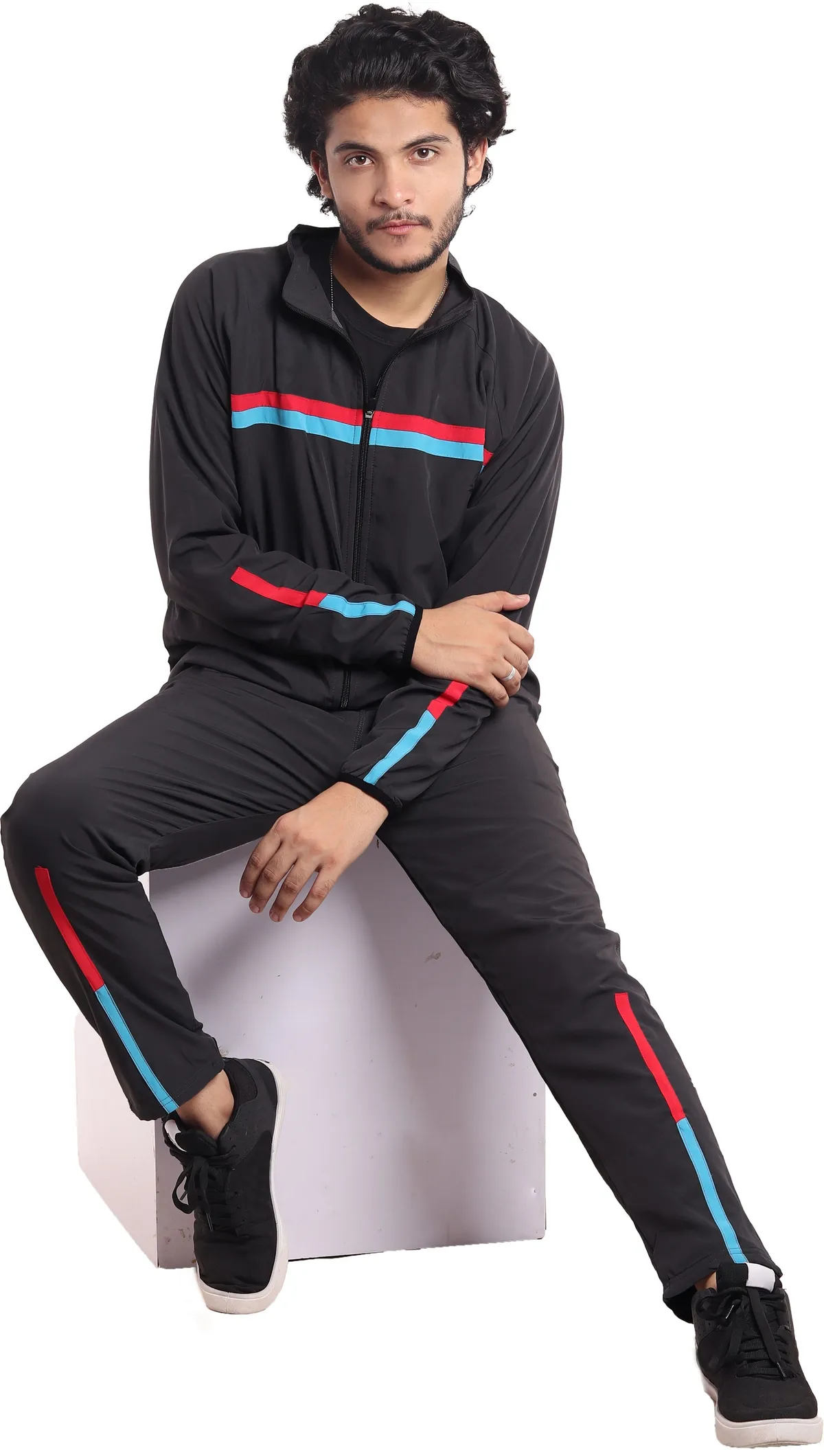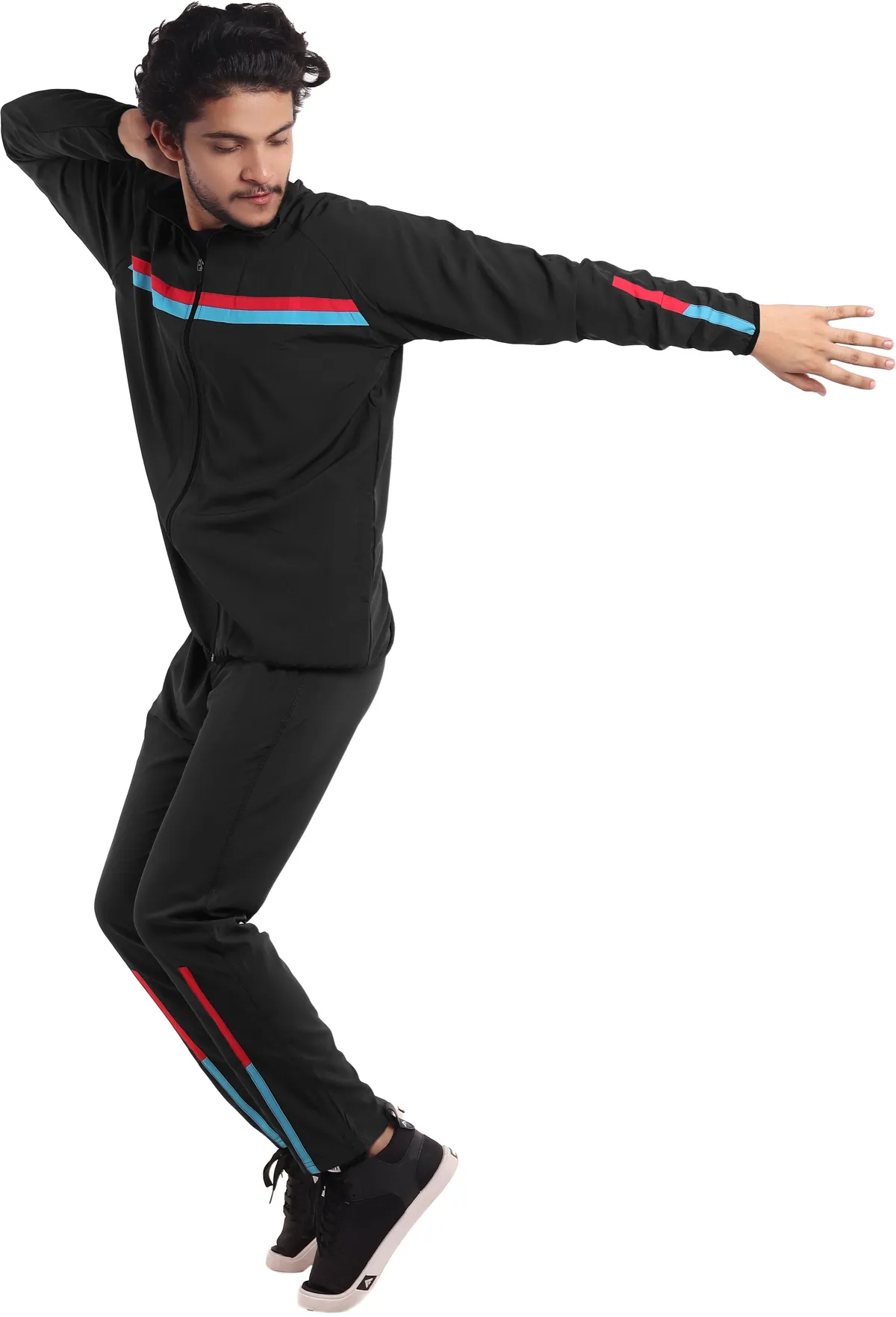 Black Polyester Lycra Blend Zip Solid Track Suit For Men | Adaaistic