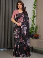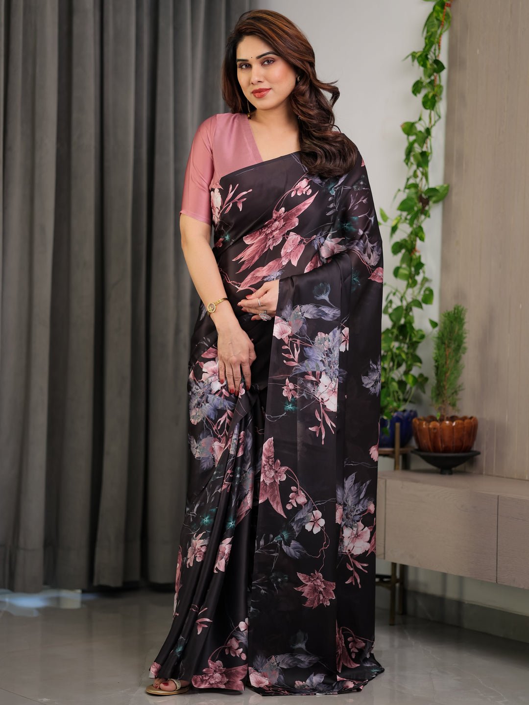 Black Satin Georgette Floral Printed Saree with Attached Blouse – Elegant Soft-Flow Designer Saree in Mauve Pink Florals | Crown Fashion