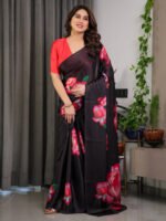 Be the first to review “Black Satin Georgette Rose Printed Saree with Attached Blouse – Elegant Partywear Designer Saree with Red Floral Artwork | Crown Fashion”