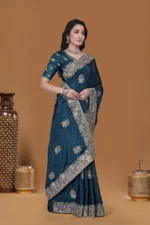 This elegant saree is designed for women who love classic style with rich detailing. The deep base creates a striking contrast with the intricate zari embroidery that runs along the border and pallu. Fine butis are evenly placed across the saree, adding depth without overpowering the look. The embroidery features traditional floral and paisley motifs, finished with a subtle shimmer that looks graceful under both day and evening lights. The saree drapes beautifully, giving a flattering fall that suits festive gatherings, weddings, receptions and special occasions. Paired with a matching embroidered blouse, it creates a complete and polished look. The fabric feels comfortable on the skin while maintaining a structured drape, making it suitable for long hours of wear. This saree works well with traditional silver or gold jewellery and can be styled in multiple draping styles to suit your personal taste.