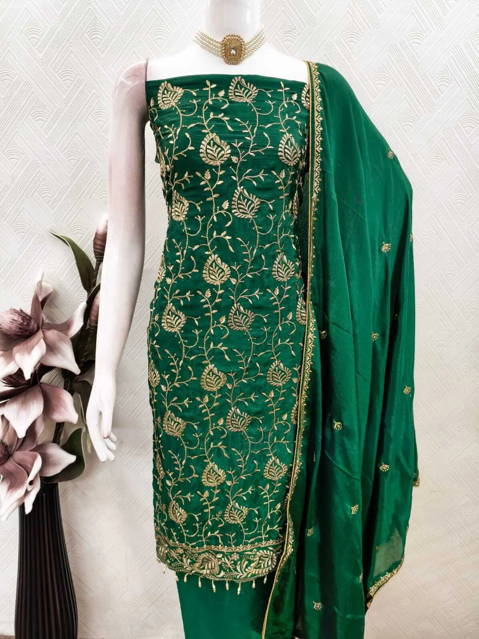 This elegant embroidered suit set is designed to bring a rich ethnic look with everyday comfort. The straight-fit kurta features detailed golden floral embroidery that adds a graceful and festive touch. Paired with a matching bottom and a lightweight dupatta with subtle embroidery, the set creates a complete traditional outfit suitable for special occasions. The fabric feels smooth and comfortable on the skin, making it ideal for long hours of wear. Perfect for festivals, family functions, weddings, and ethnic office days, this suit set blends classic Indian craftsmanship with a clean, modern silhouette.
