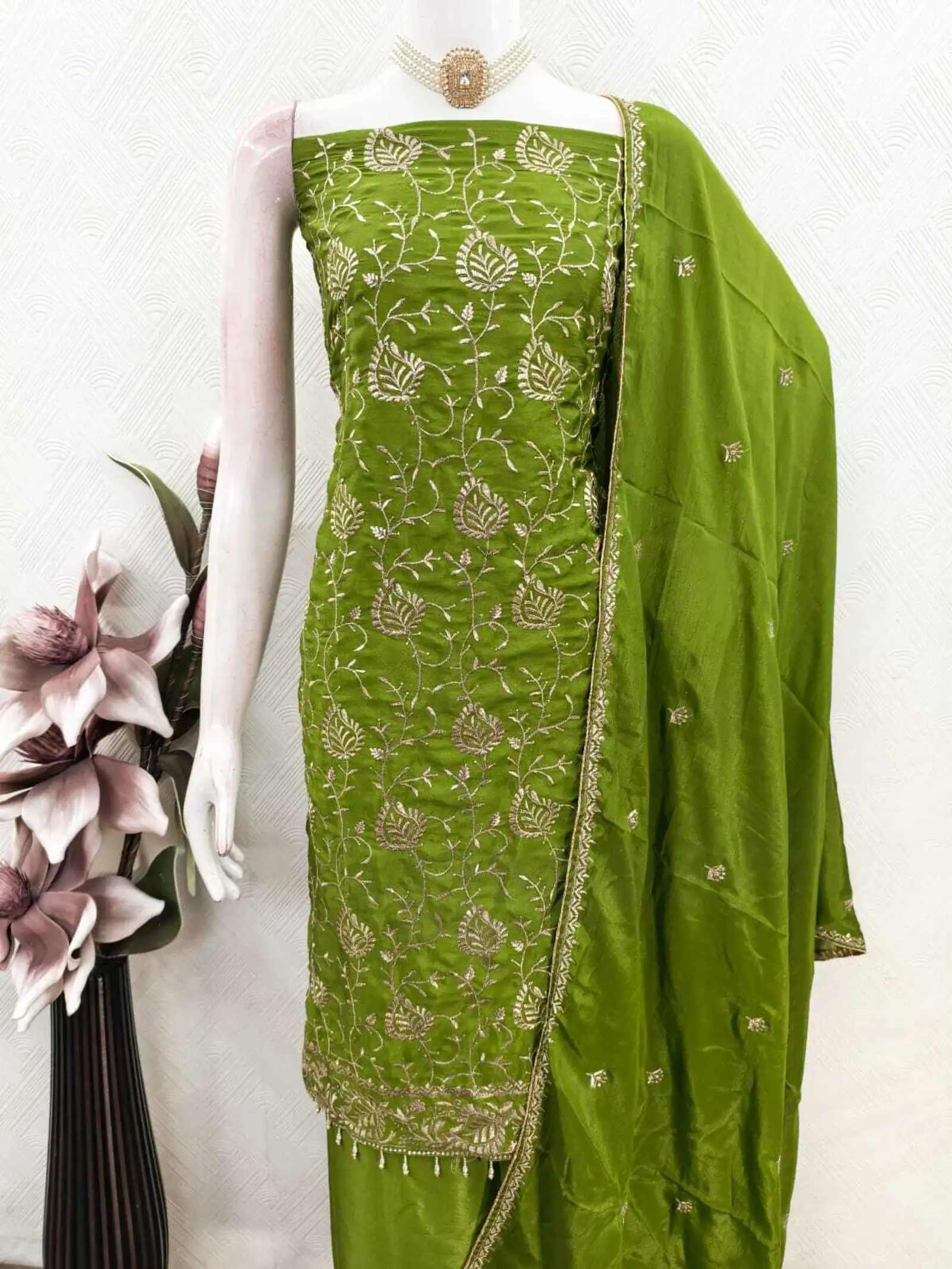 This emerald embroidered suit set is a timeless choice for festive occasions and special gatherings. The straight-fit kurta features detailed gold thread embroidery with elegant floral and vine motifs that give the outfit a rich, traditional look. Paired with a matching bottom and a soft, flowy dupatta finished with delicate borders, the set feels graceful without being heavy. The fabric has a smooth, refined texture that drapes beautifully and stays comfortable for long hours. Whether styled with statement jewelry for weddings or kept minimal for festive dinners, this suit set offers a perfect balance of tradition, elegance, and everyday comfort.