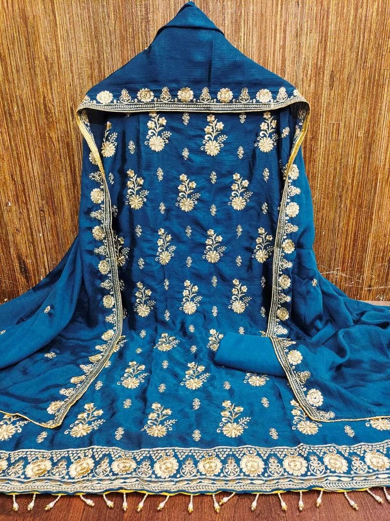 Designer Georgette (SINON SILLK) Zari Embroidered Unstitched Dress Material for Women Type: Unstitched Dress Material Style: Elegant Ethnic Wear | Ideal for Parties, Weddings, and Festive Occasions Fabric Category: Premium Georgette (SINO SILLK) with Zari Embroidery Top Fabric Material: Soft Georgette(SINON SILLK) Length: 2.01 to 2.25 Meters Design: Beautiful Allover Embroidered Work with Zari Highlights Bottom Fabric Material: Crepe / Cotton Blend Length: 3.5 to 3.6 Meters (sufficient for stylish bottom designs) Style: Can be stitched as palazzo, churidar, sharara, or salwar Lining (Inner) Material: Crepe Length: Included with bottom fabric (3.6 Meters combined) Comfort: Lightweight and breathable for all-day wear Dupatta Material: Georgette (SINON SILLK) Length: 2.1 to 2.25 Meters Design: Zari Embroidered Border with 4-Side Lace for an Elegant Finish Product Highlights Zari Embroidered Top with Stylish Floral Motifs Four-Side Lace Dupatta with Rich Zari Work Includes Lining & Extra Bottom Fabric for Versatile Stitching Premium Georgette (SINO SILLK) Fabric for a Flowing, Graceful Look Perfect for Traditional Events, Party Wear, and Engagement Outfits What’s Included Top: Georgette (SINO SILLK) (2.2 Meters) with Zari Embroidery Bottom + Lining: Crepe / Cotton Blend (3.5 – 3.6 Meters total) Dupatta: Georgette(SINO SILLK) with Zari Embroidery & Lace (2.1 – 2.25 Meters) Pattern: Embroidered | Zari Embroidery Net Quantity (N): 1 Set Disclaimer Accessories shown in images are for presentation purposes only and not part of the product. Product color may slightly vary due to lighting and display settings.