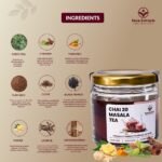 Ingredients: Black Tea, Cardamom, Cinnamon, Clove, Ginger, Black Pepper, Tulsi, Fennel, Nutmeg, Bay Leaf, Star Anise, Mulethi, Ajwain, Dry Ginger, Rose Petals, Saffron, Lemongrass, Mint Leaves, Javitri, and Ashwagandha.