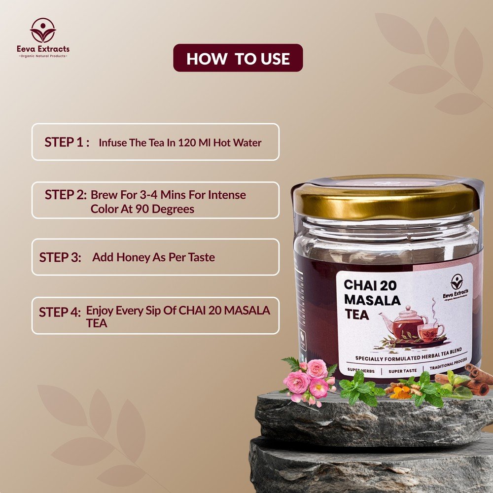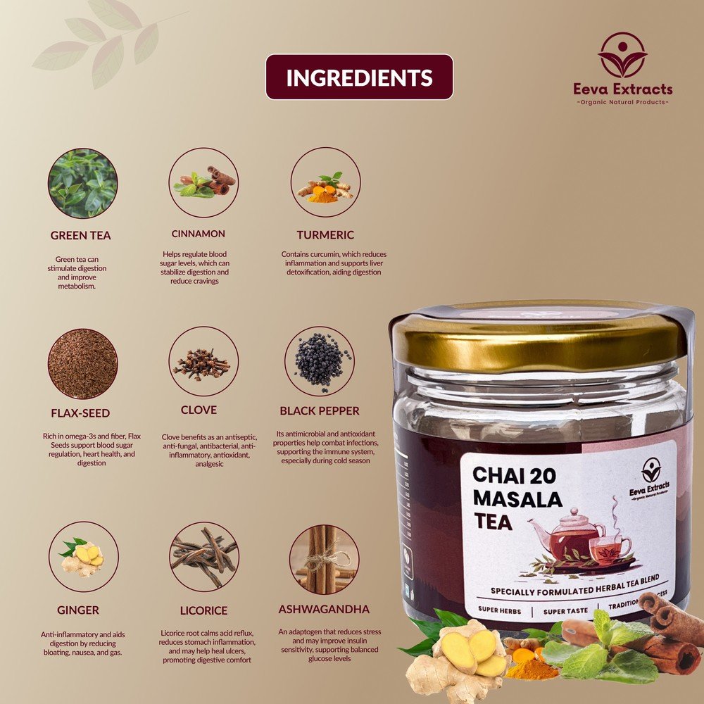 Chai 20 Masala Tea by Eeva Extracts is a rich blend of traditional Indian spices crafted to deliver a strong, aromatic, and refreshing tea experience. Made with a carefully selected mix of 20 natural masala ingredients, this tea helps boost immunity, supports digestion, and provides warmth and comfort with every sip. Its flavorful taste and soothing aroma make it perfect for daily use, especially during changing seasons. Enjoy a healthy and energizing cup of masala chai that combines taste, tradition, and wellness in every brew.