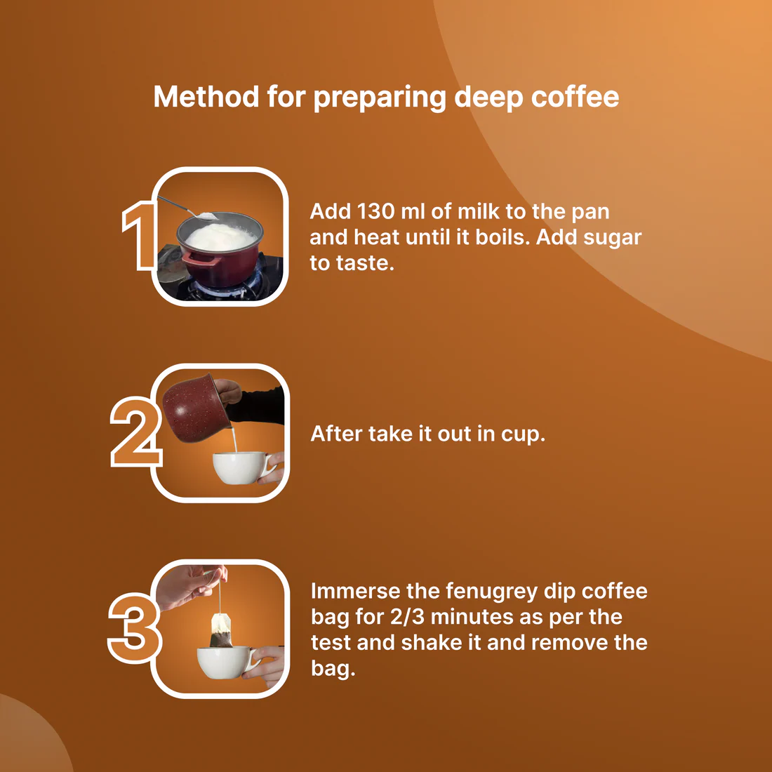 Boil 120 ml milk with sugar as per taste until it comes to a boil, then submerge the coffee bag for two to three minutes and take out the coffee bag immediately.