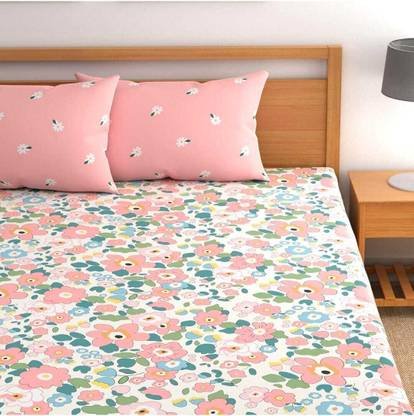 Cotton King Fitted (Elastic) 144 TC Geometric Bedsheet (Pack of 1, Pink Floral) | HOMDAZAL