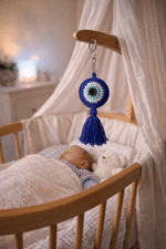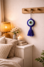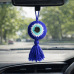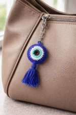 Handcrafted crochet evil eye charm with tassel – perfect as keychain, bag charm, car hanging, or decorative nazar battu for home & gifting.