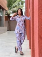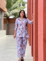 This stylish women’s co-ord set combines modern fashion with everyday comfort. The coordinated floral print on both the top and pants creates a balanced and fashionable appearance. Lightweight cotton fabric keeps you comfortable in warm weather, while the relaxed fit makes it suitable for long hours of wear.