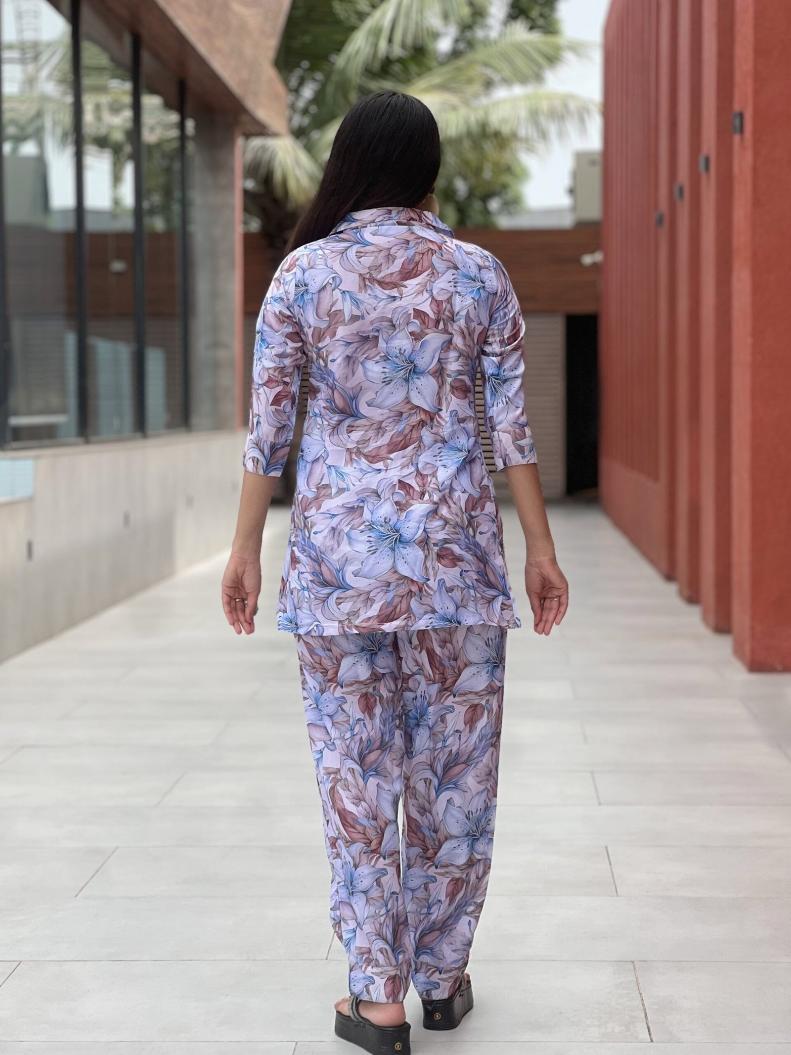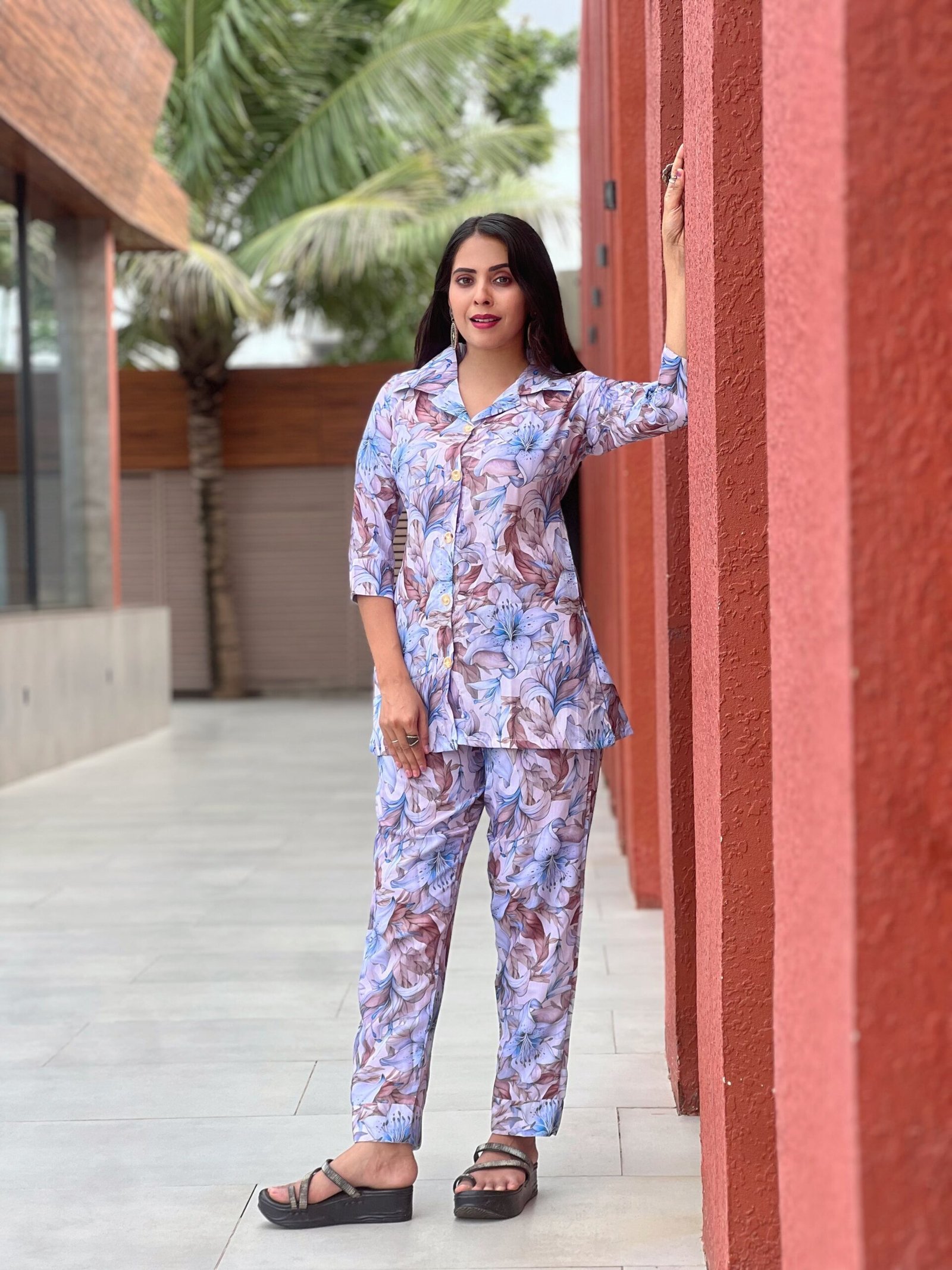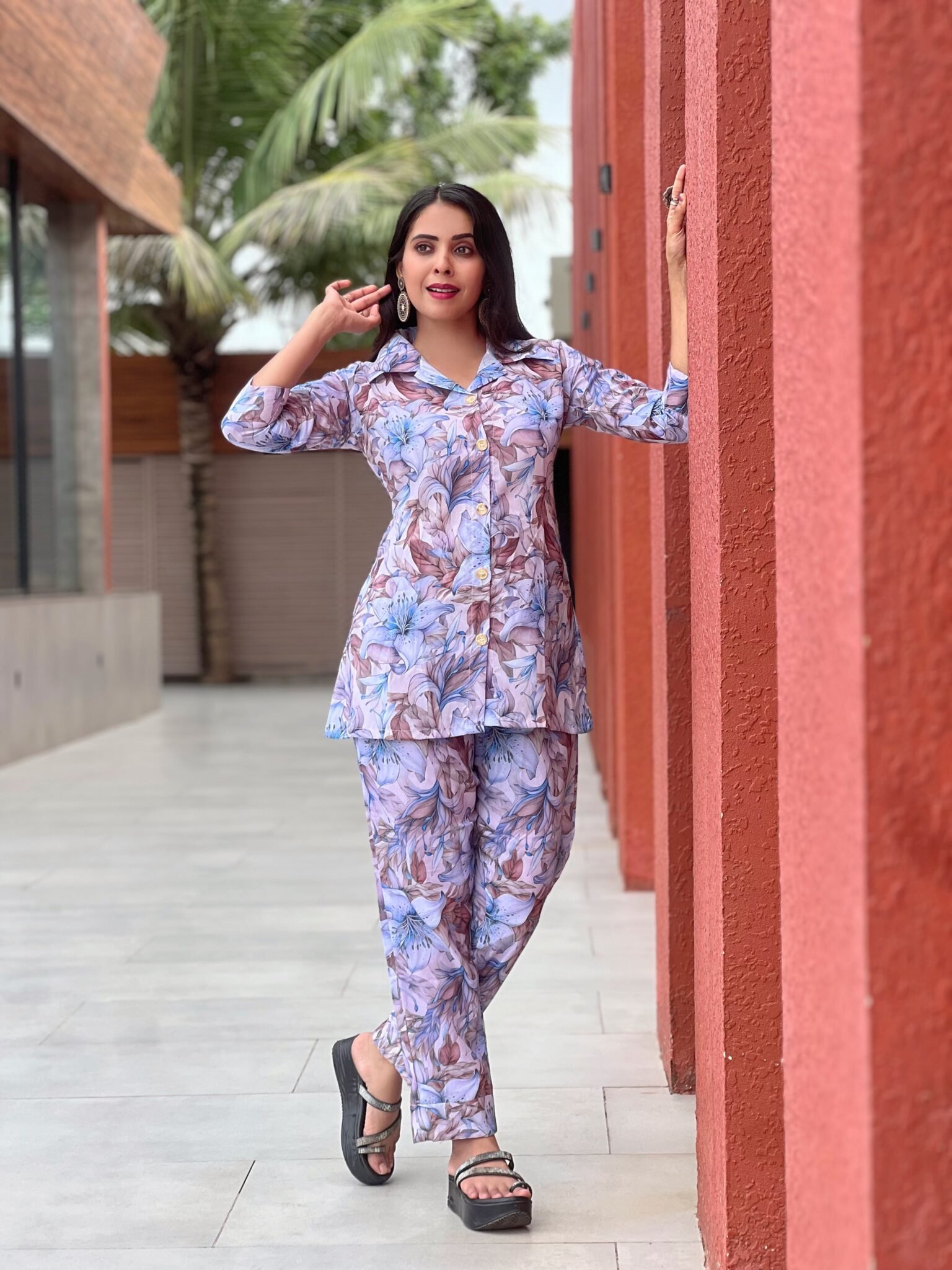 Enhance your everyday style with this beautiful floral printed women’s co-ord set, designed for comfort and elegance. The outfit features a matching floral printed shirt-style top paired with coordinated straight-fit pants, creating a trendy and effortless look. Made from soft and breathable cotton fabric, this set ensures comfort throughout the day. The elegant floral design and modern silhouette make it perfect for casual outings, daily wear, travel, or relaxed gatherings.