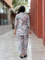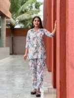 This women’s co-ord set is designed for both style and comfort. The floral print adds a fresh and trendy appearance, while the lightweight cotton fabric keeps you comfortable in all seasons. The coordinated top and pant combination creates a fashionable yet effortless look suitable for everyday wear.