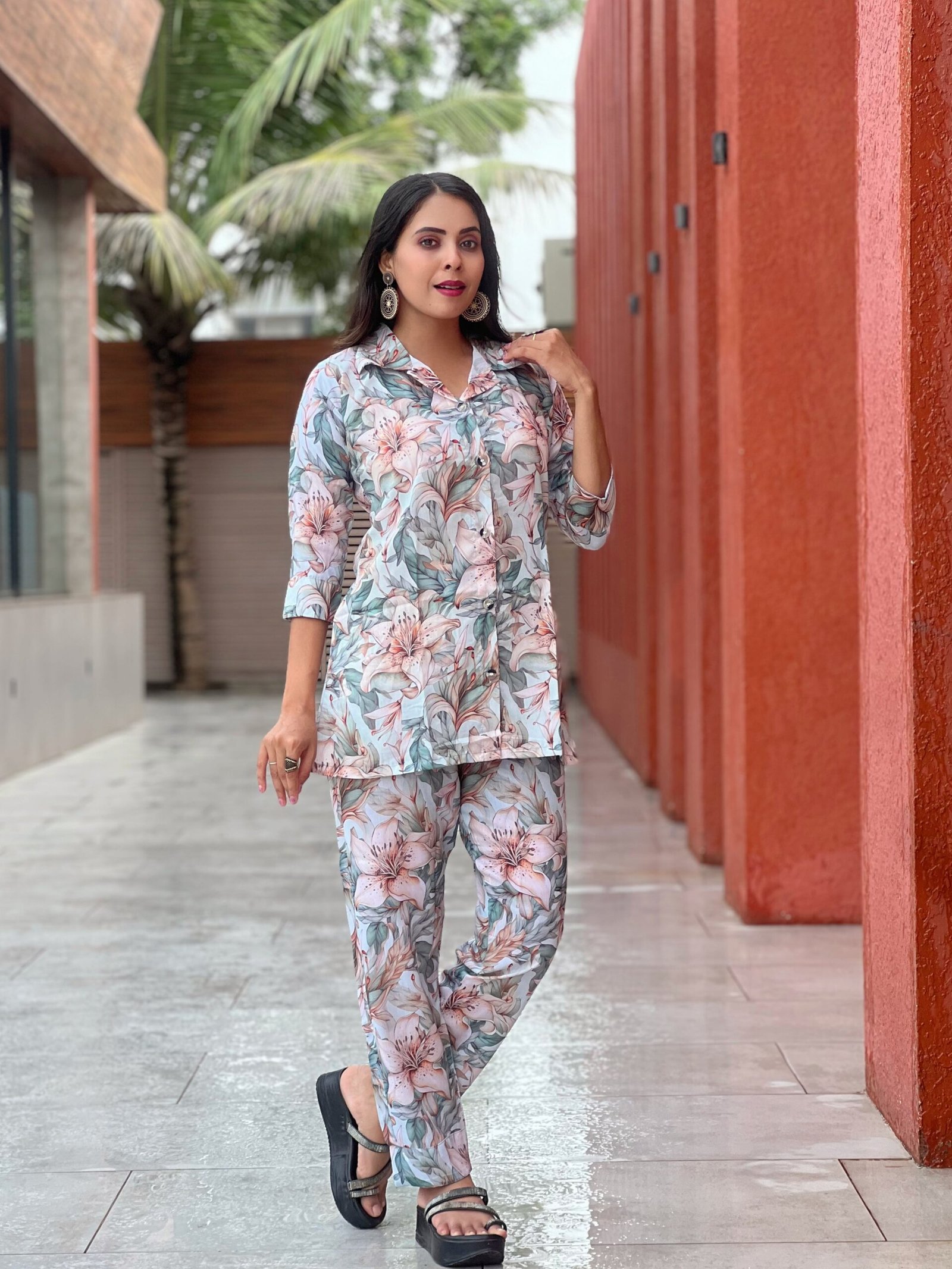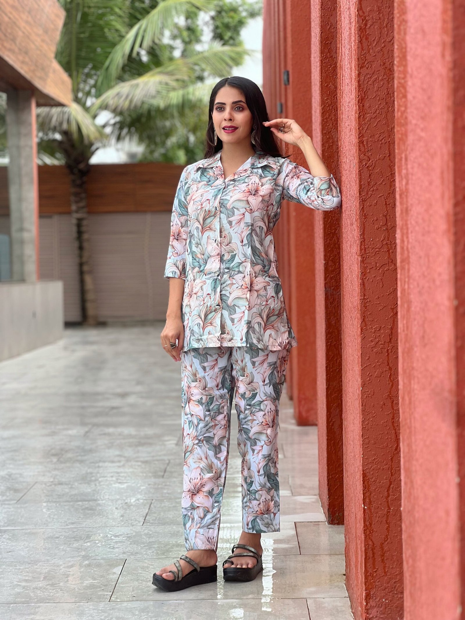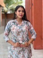 Add elegance and comfort to your wardrobe with this beautiful floral printed women’s co-ord set. This stylish outfit features a matching floral printed top and straight-fit pants designed for a modern and relaxed look. Made from soft and breathable cotton fabric, it ensures maximum comfort throughout the day. The delicate floral pattern combined with a comfortable fit makes it perfect for casual outings, daily wear, travel, and relaxed gatherings.