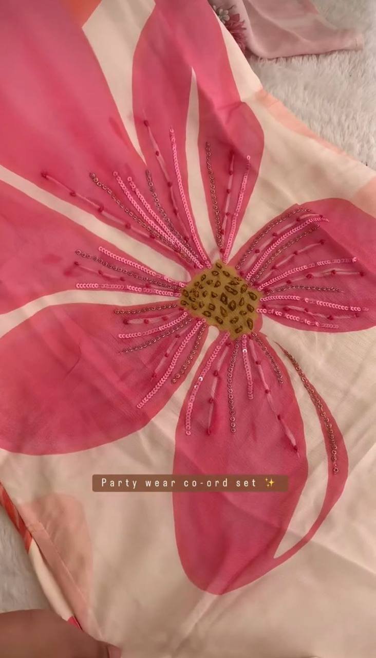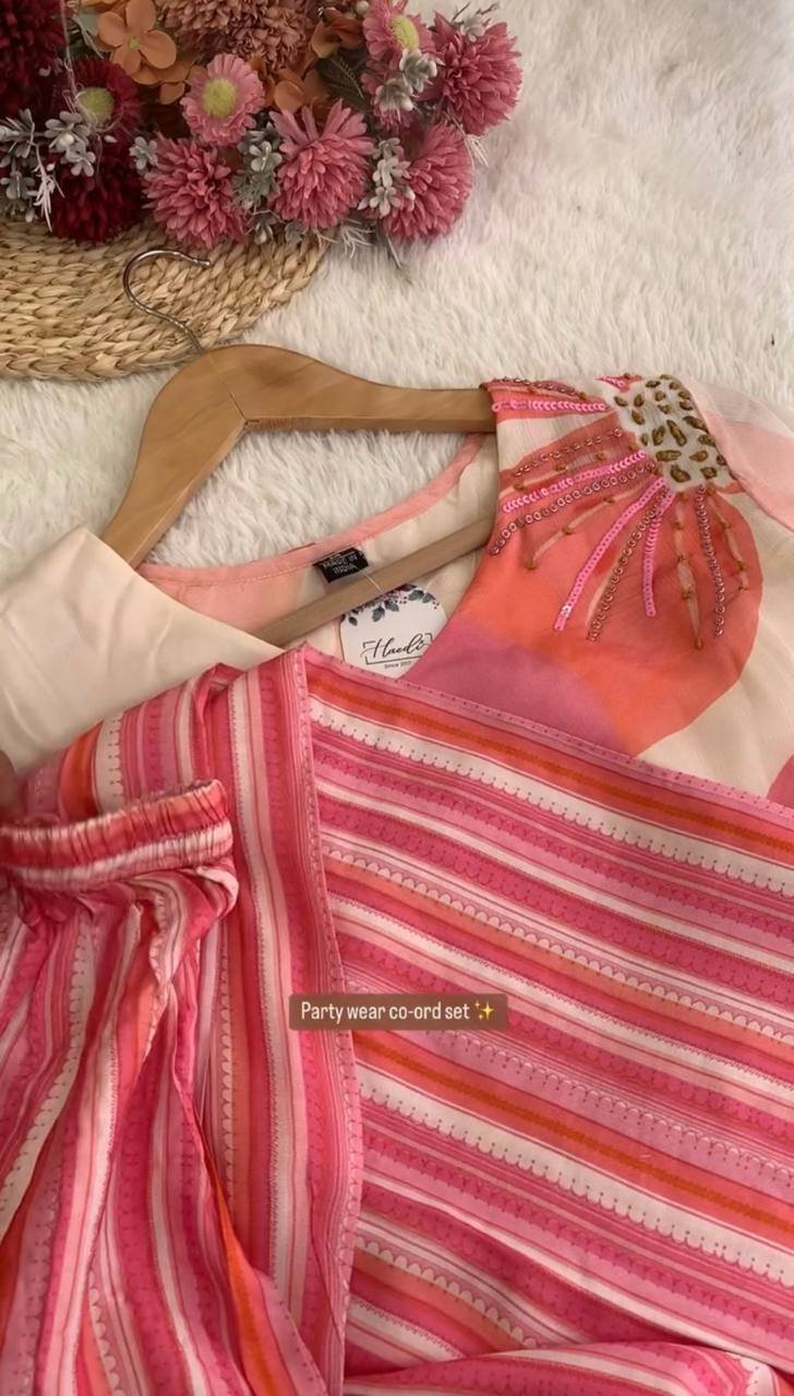 The lightweight faux georgette top paired with a comfortable maslin plazo ensures ease of wear, making it ideal for casual outings, daytime events, and light festive occasions. A perfect choice for effortless style and comfort.
