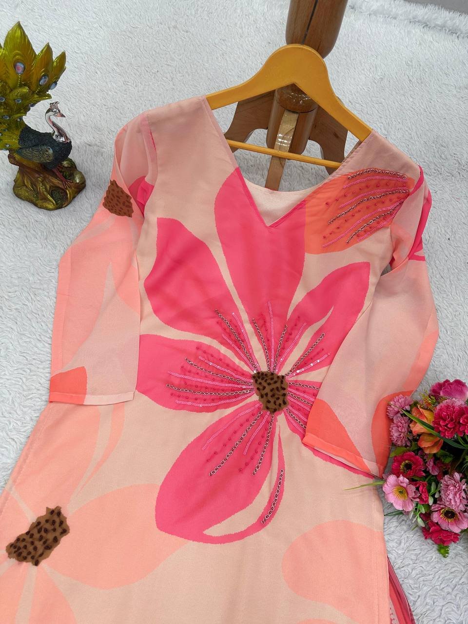 This outfit is designed for women who love trendy and comfortable ethnic wear. The combination of digital prints and fine handwork gives it a unique and fashionable look, while the breathable fabric ensures all-day comfort. A great pick for everyday elegance.