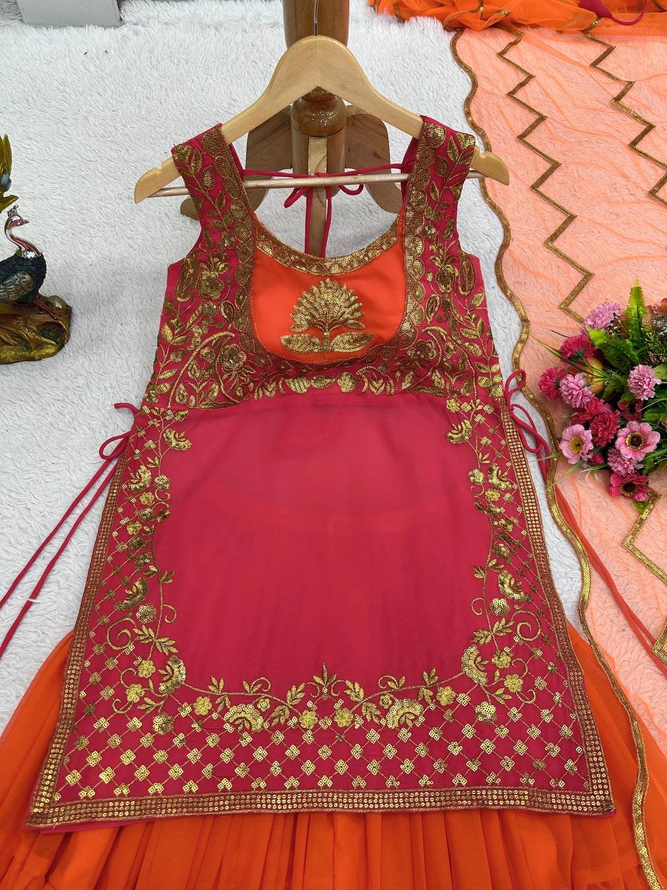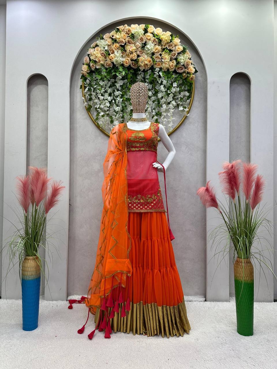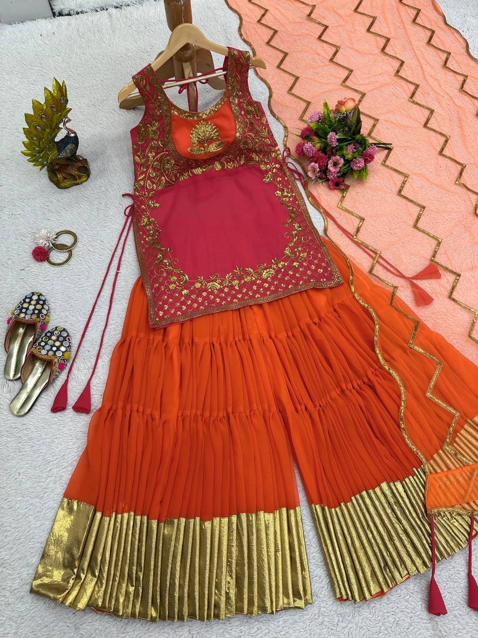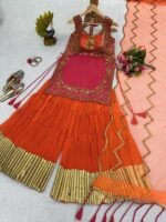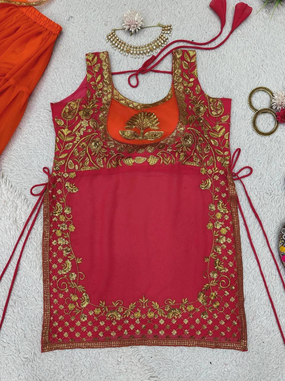 Step into luxury with this stunning 5000 Series Faux Georgette Plazo Set. Designed with elegant thread embroidery, sequins work, and stylish dori latkan detailing, this outfit brings a rich festive vibe with a modern touch.
