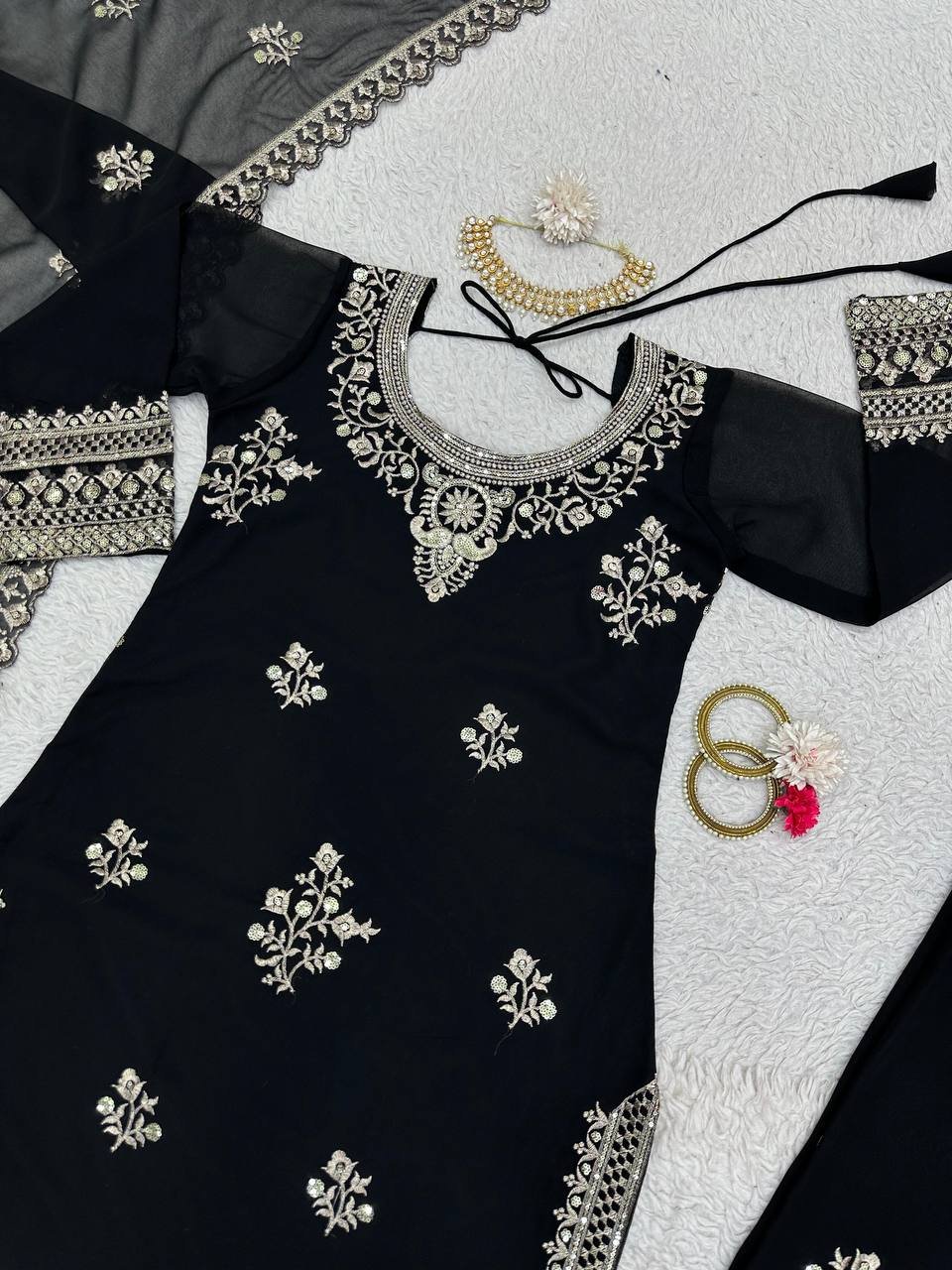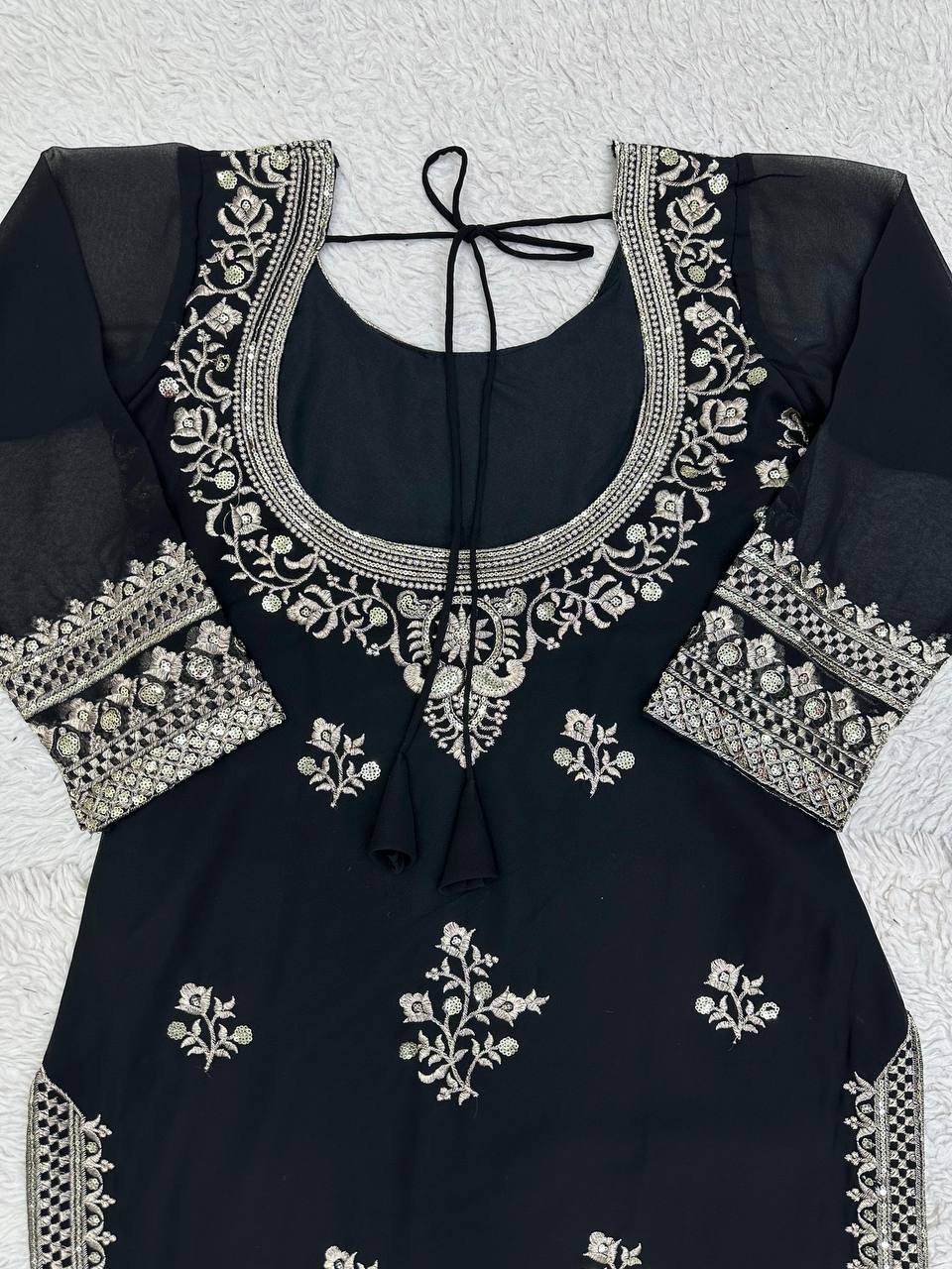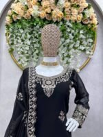 This designer set is crafted for women who love premium ethnic fashion with elegant detailing. The lightweight faux georgette fabric provides comfort, while the sequins work adds a subtle festive sparkle. A perfect choice for stylish and confident looks.