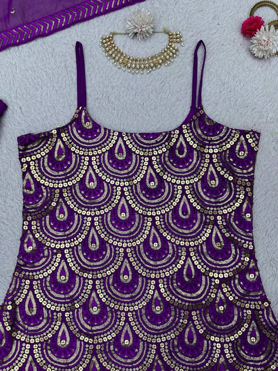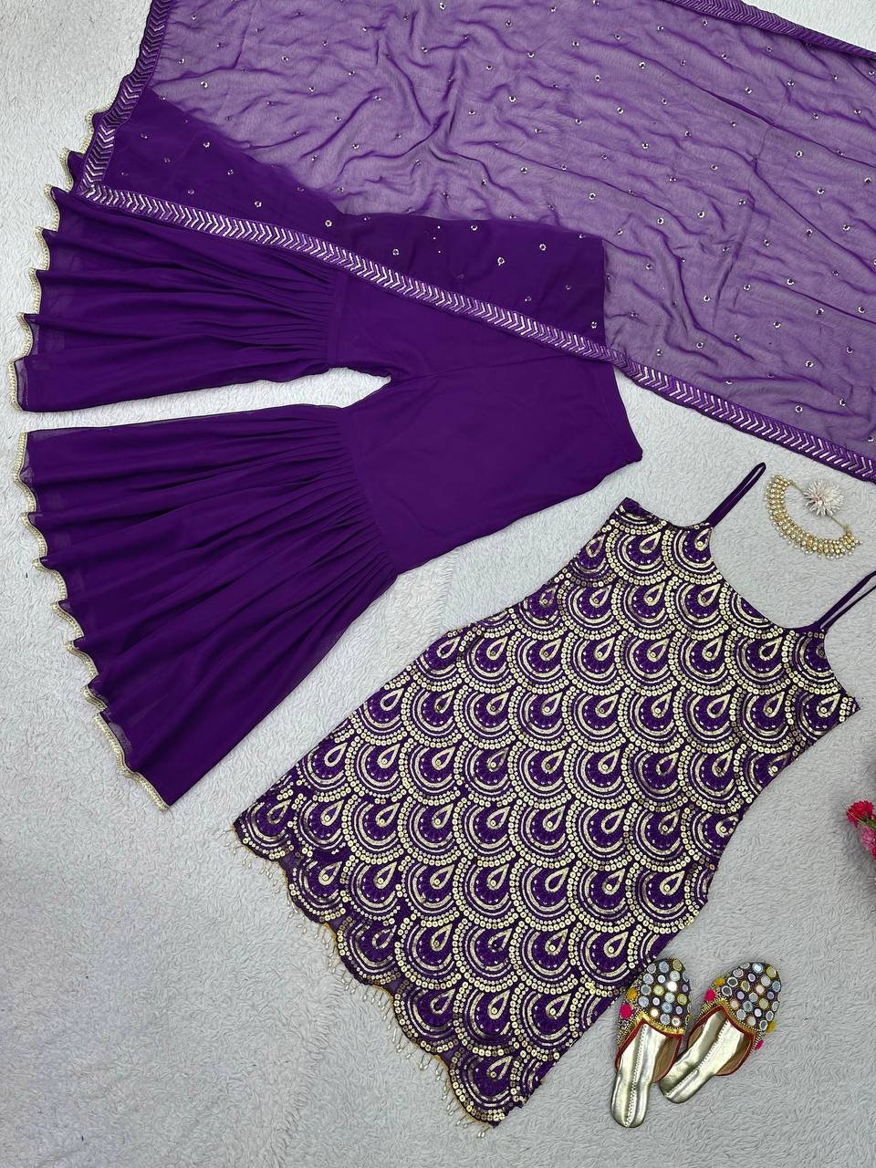 Upgrade your ethnic wardrobe with this stunning 5000 Series Faux Georgette Sharara Set. Designed with premium 9mm sequins work and delicate fancy lace borders, this outfit brings a perfect balance of elegance and glamour.