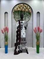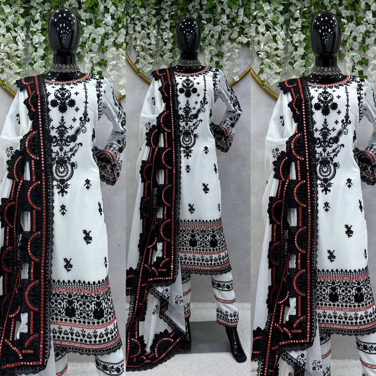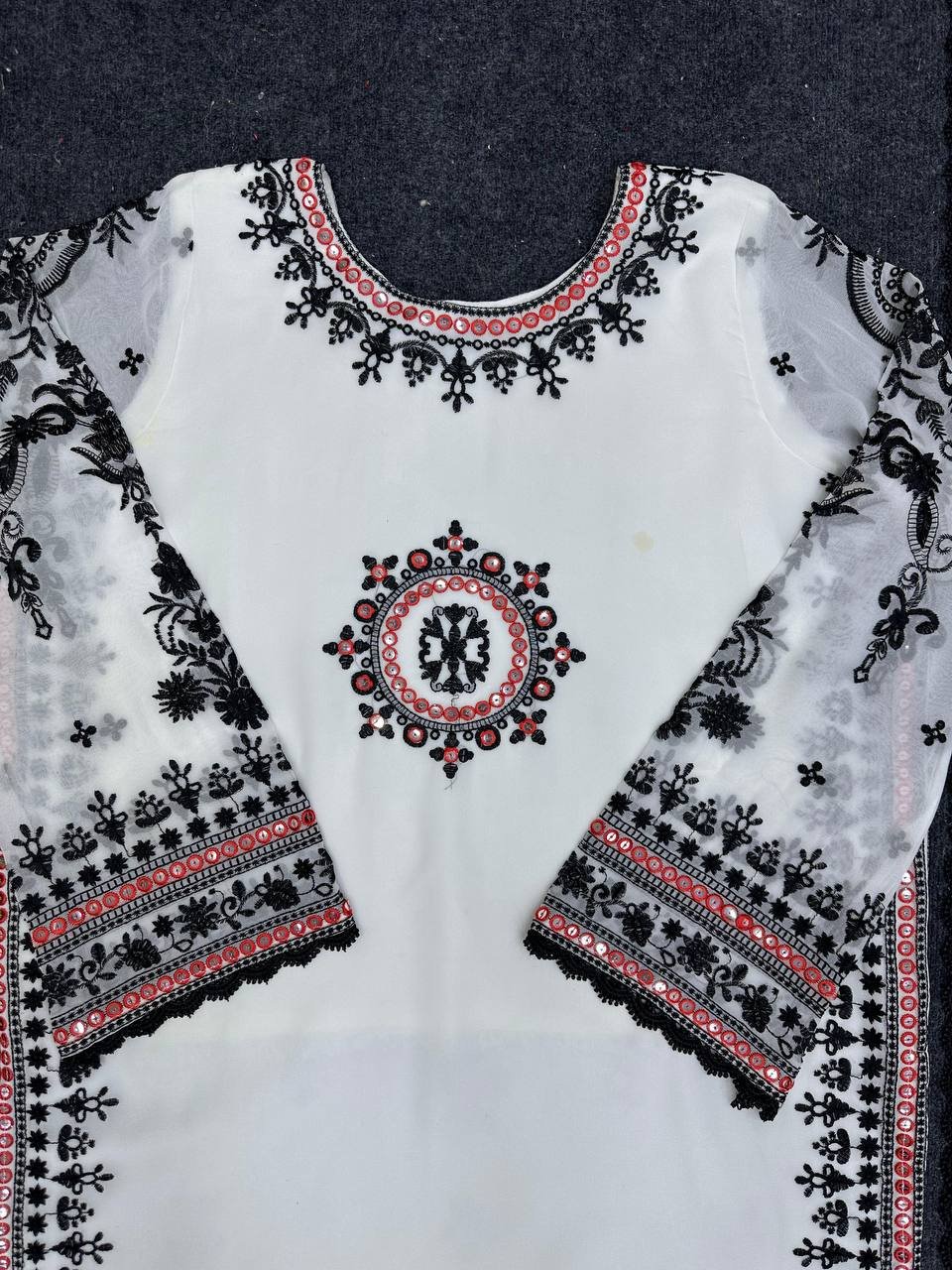Step into elegance with this premium 5000 Series Faux Georgette Suit Set. Designed with intricate 9mm sequins work and elegant GPO lace borders, this outfit delivers a rich and stylish ethnic look.