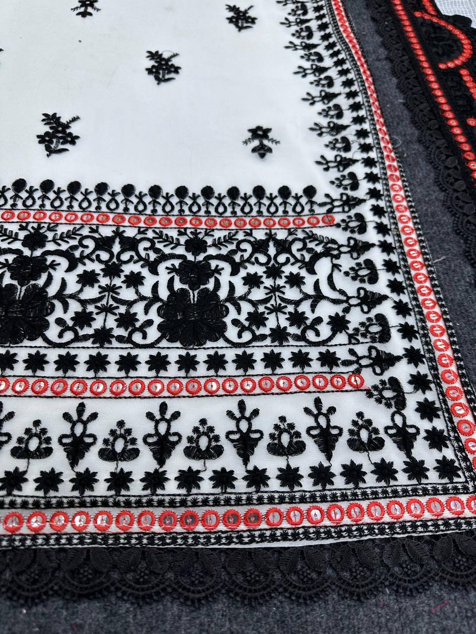 | Dupatta Work | Thread Work with 9mm Sequins & Four-Side GPO Lace Border |