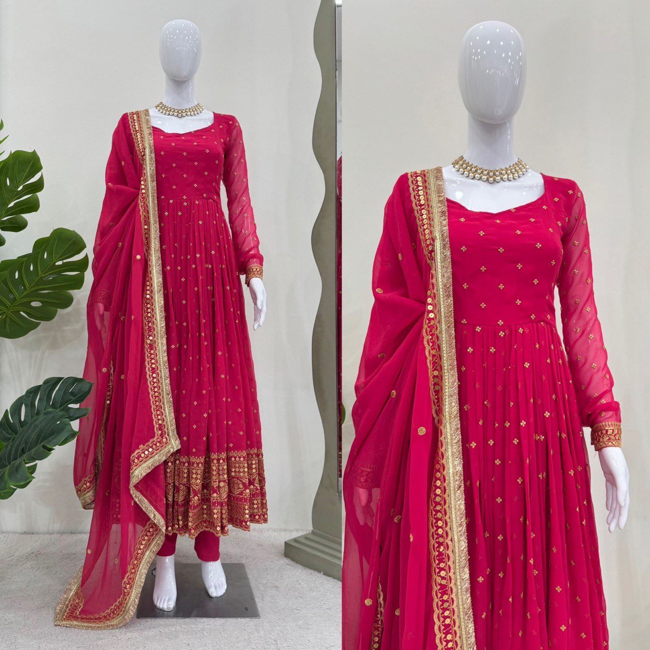 This elegant Faux Georgette Suit from the 5000 Series features detailed thread embroidery combined with premium 9mm sequins work, creating a rich and festive look. The soft micro cotton pant ensures all-day comfort and ease of wear.