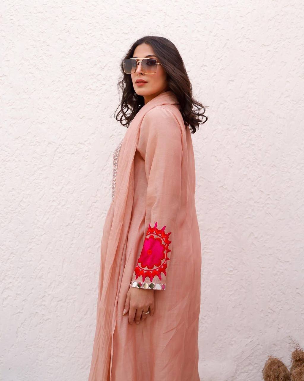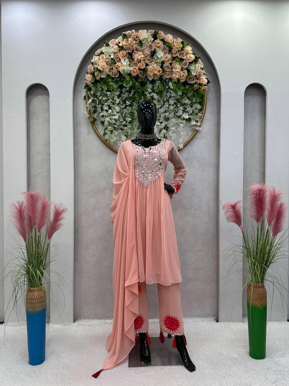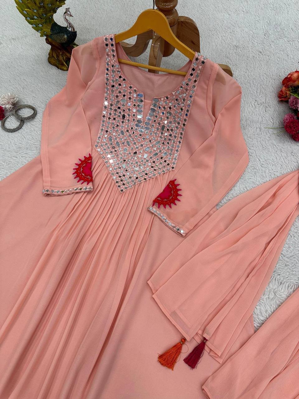 This designer suit set is crafted for women who love traditional fashion with a bold festive touch. The lightweight faux georgette fabric ensures comfort, while the real mirror work enhances its premium appeal. A perfect outfit for standout ethnic styling.
