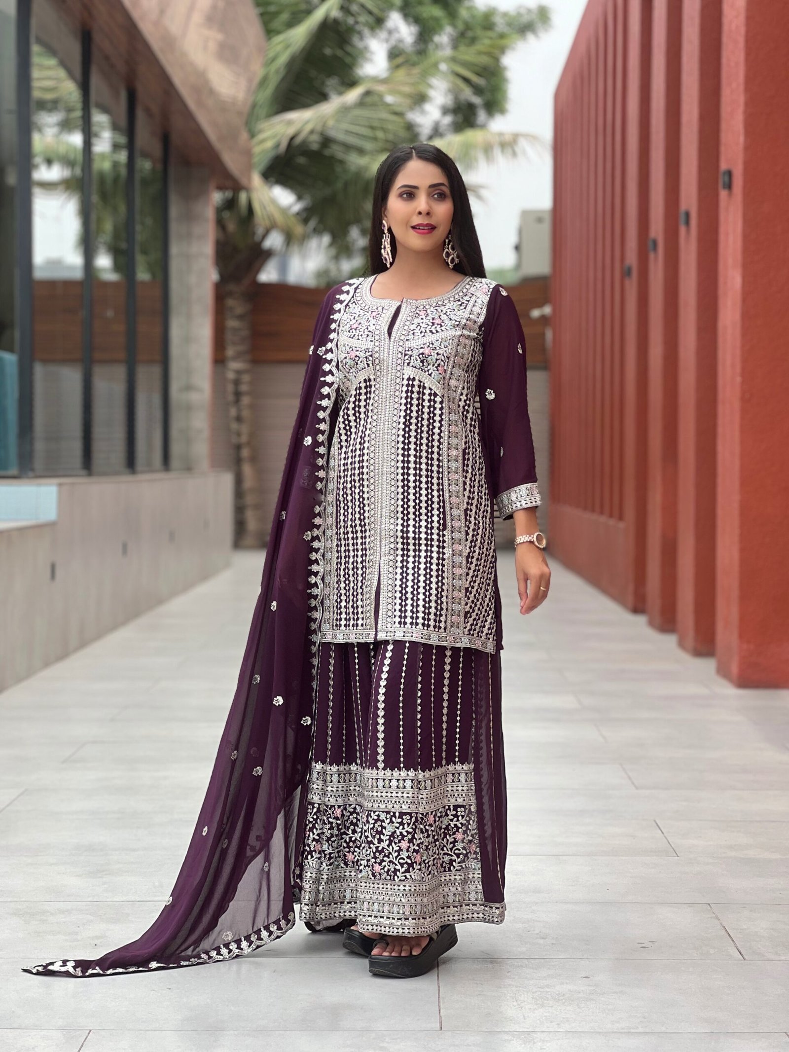 Step into elegance with this wine purple embroidered kurti sharara set, crafted for a regal and sophisticated look. The intricately embroidered kurti paired with a beautifully detailed sharara and a lightweight dupatta creates a stunning festive ensemble. The rich color and detailed craftsmanship make it perfect for weddings and special occasions.