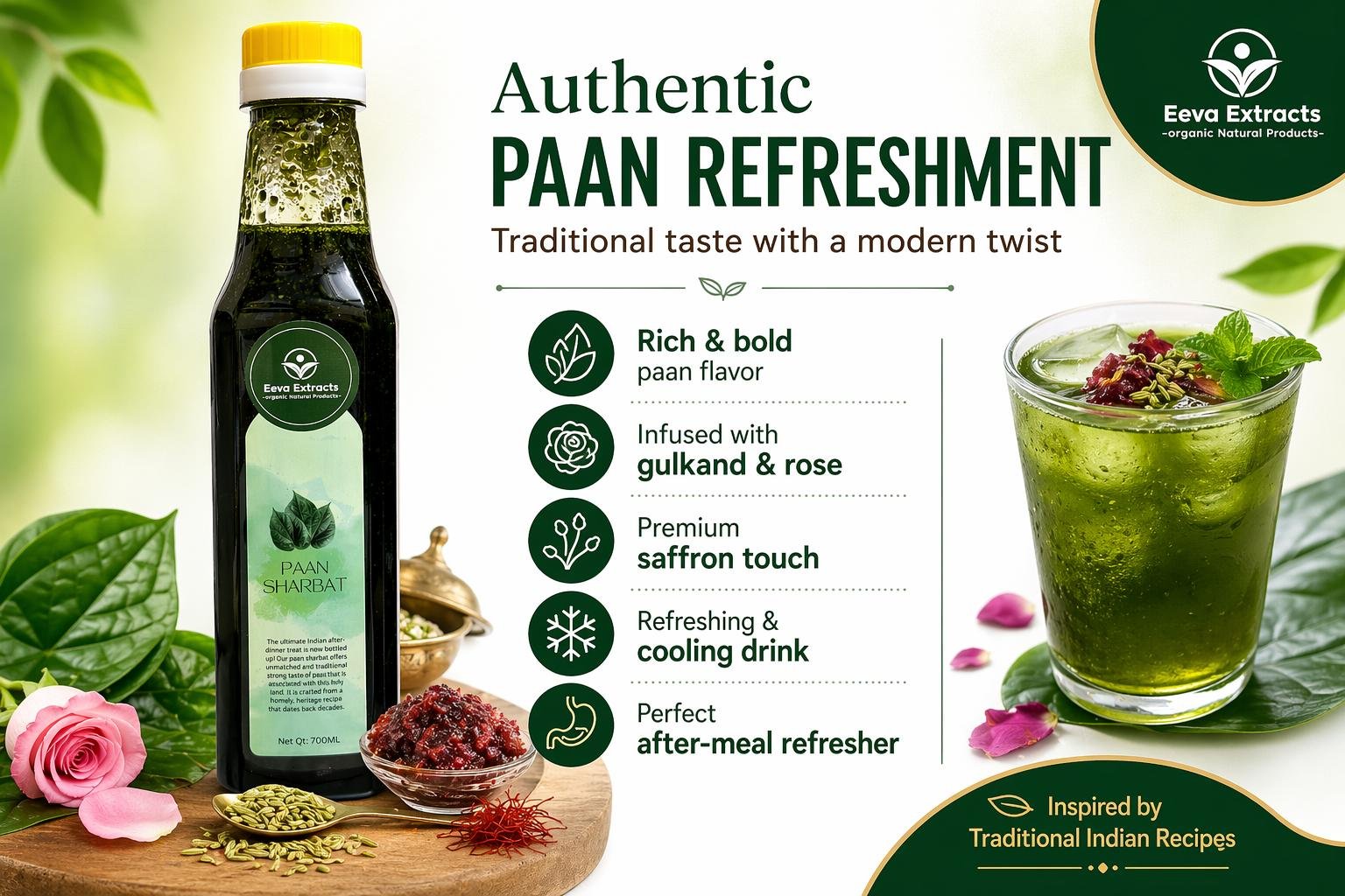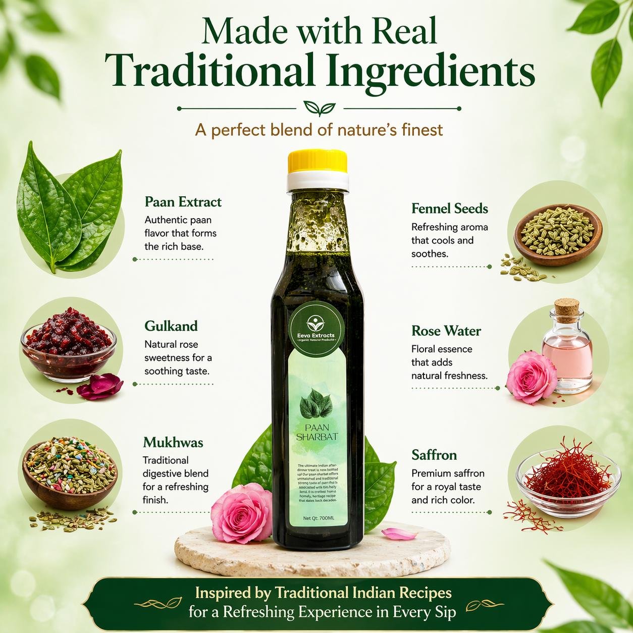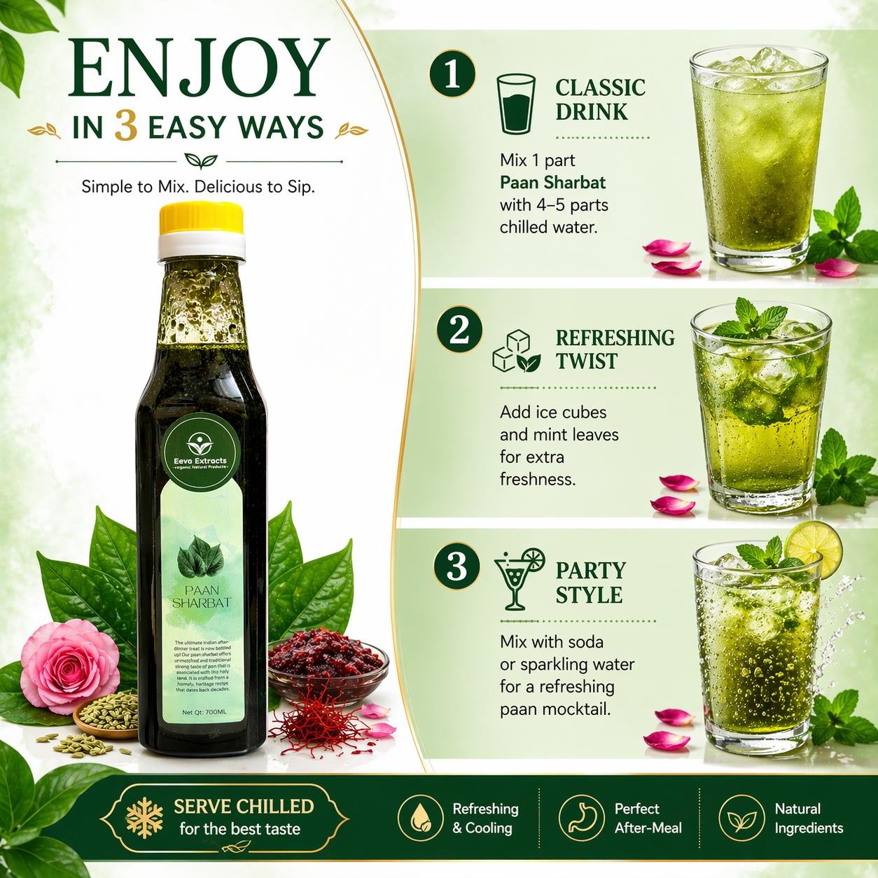 Eeva Extracts – Pan (Betel) Extracts Sharbat I No Added Water Content IMixer for Mocktails, Cocktails, Drinks, Juices, Beverages Transparent I No Artificial Colors And Flavors I Authentic Taste I 2 Piece Ctc Neck Cap I Non Alcoholic Mix 750ML Bottle