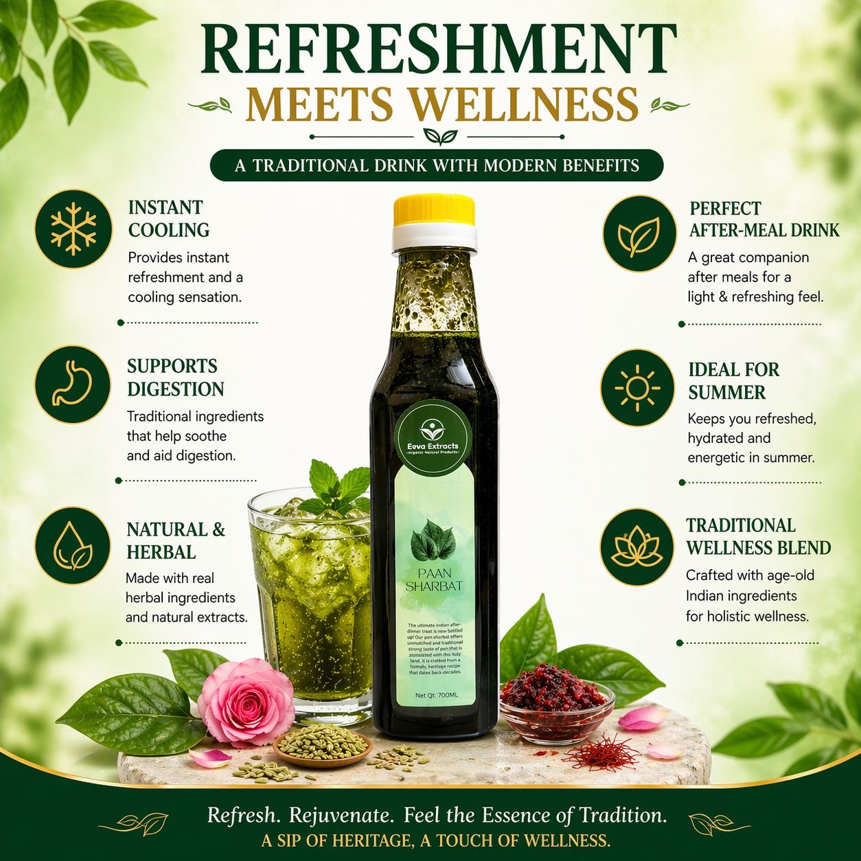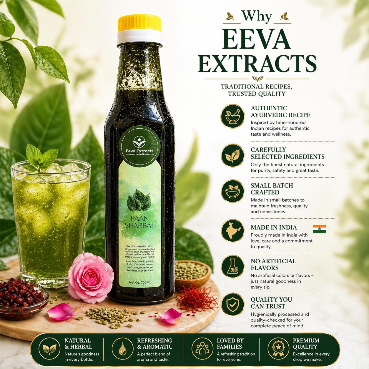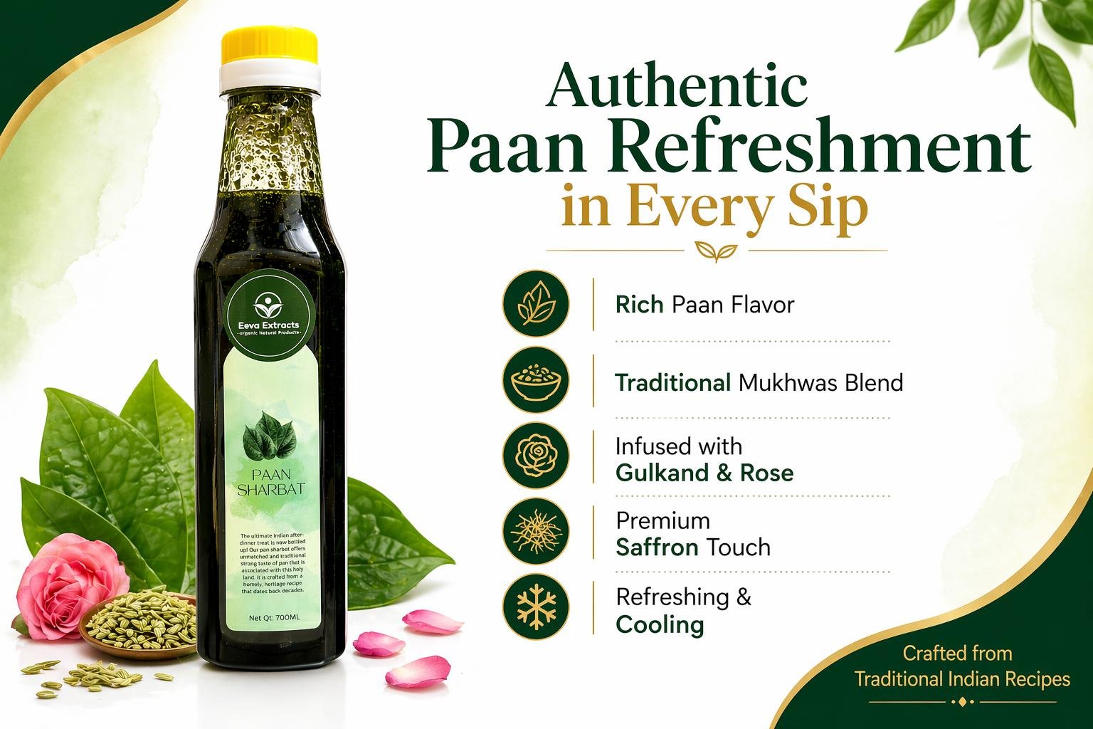 Eeva Extracts – Pan (Betel) Extracts Sharbat I No Added Water Content IMixer for Mocktails, Cocktails, Drinks, Juices, Beverages Transparent I No Artificial Colors And Flavors I Authentic Taste I 2 Piece Ctc Neck Cap I Non Alcoholic Mix 750ML Bottle