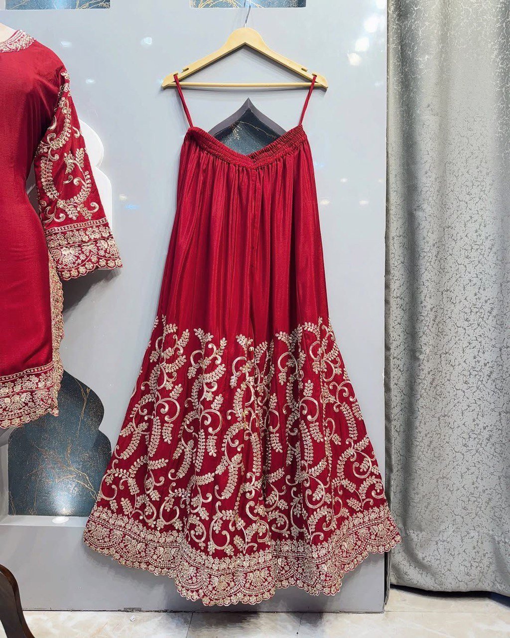 Step into festive elegance with this beautifully designed Eid Special Chinon Silk Top-Plazo Set. Crafted to offer a perfect blend of style and comfort, the top features intricate thread embroidery with sequence work, adding a subtle yet graceful shimmer.