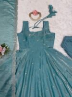 Step into festive elegance with this stunning Eid Special Fandy Silk Gown Style Set, designed for a graceful and modern ethnic look. The gown-style top features beautiful thread embroidery enhanced with sequence work, offering a rich yet subtle festive shine.