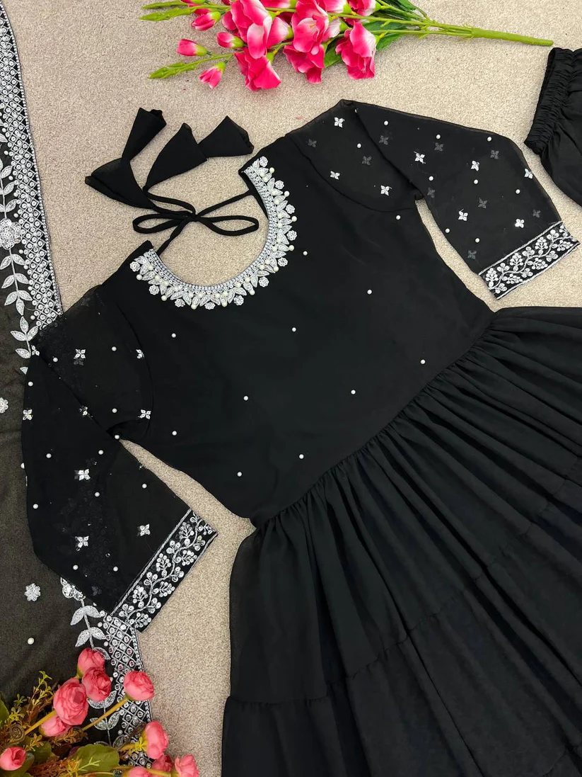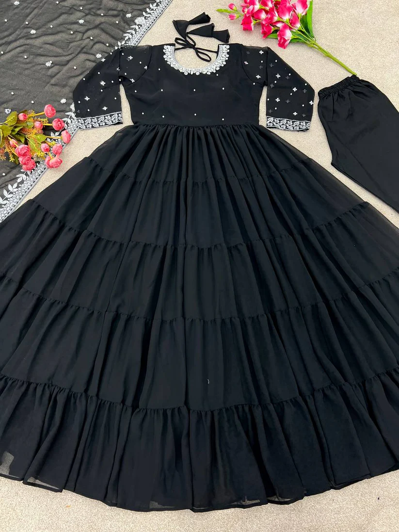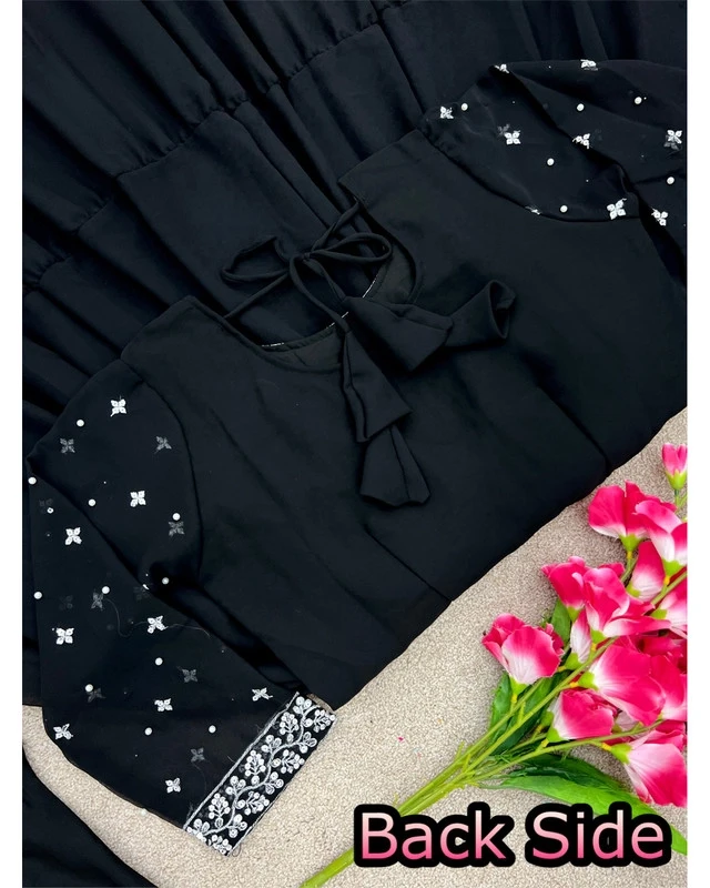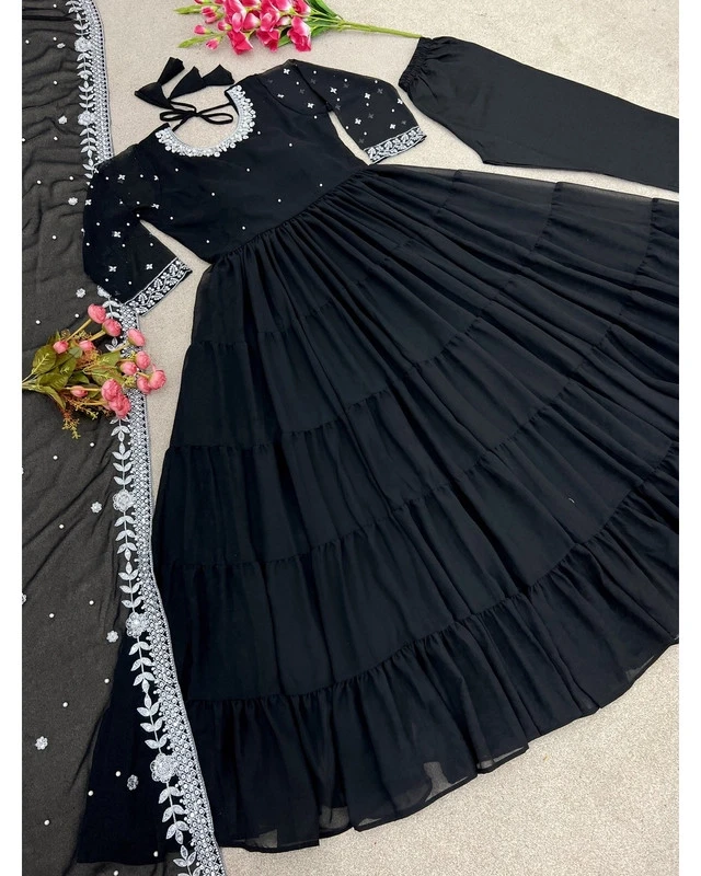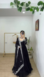 This Anarkali suit set is crafted for women who love timeless black ethnic wear with a modern touch of elegance. The combination of subtle motifs and heavy neckline embroidery gives it a balanced look—perfect for both grand and intimate occasions.