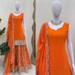 Upgrade your ethnic wardrobe with this stunning Faux Georgette Top-Plazo Set, designed to give you a graceful and festive look. The outfit features elegant thread embroidery enhanced with premium 9mm sequence work, adding a beautiful shimmer and rich appeal.