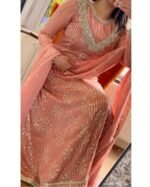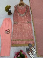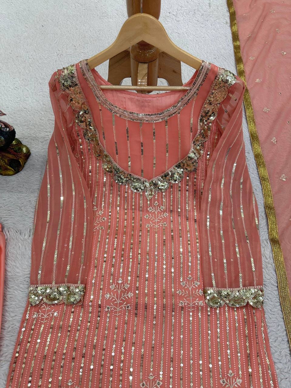 Upgrade your ethnic wardrobe with this elegant 5000 Series Faux Georgette Suit Set. Designed with fine thread embroidery and sequins work, this outfit offers a perfect blend of sophistication and festive charm.