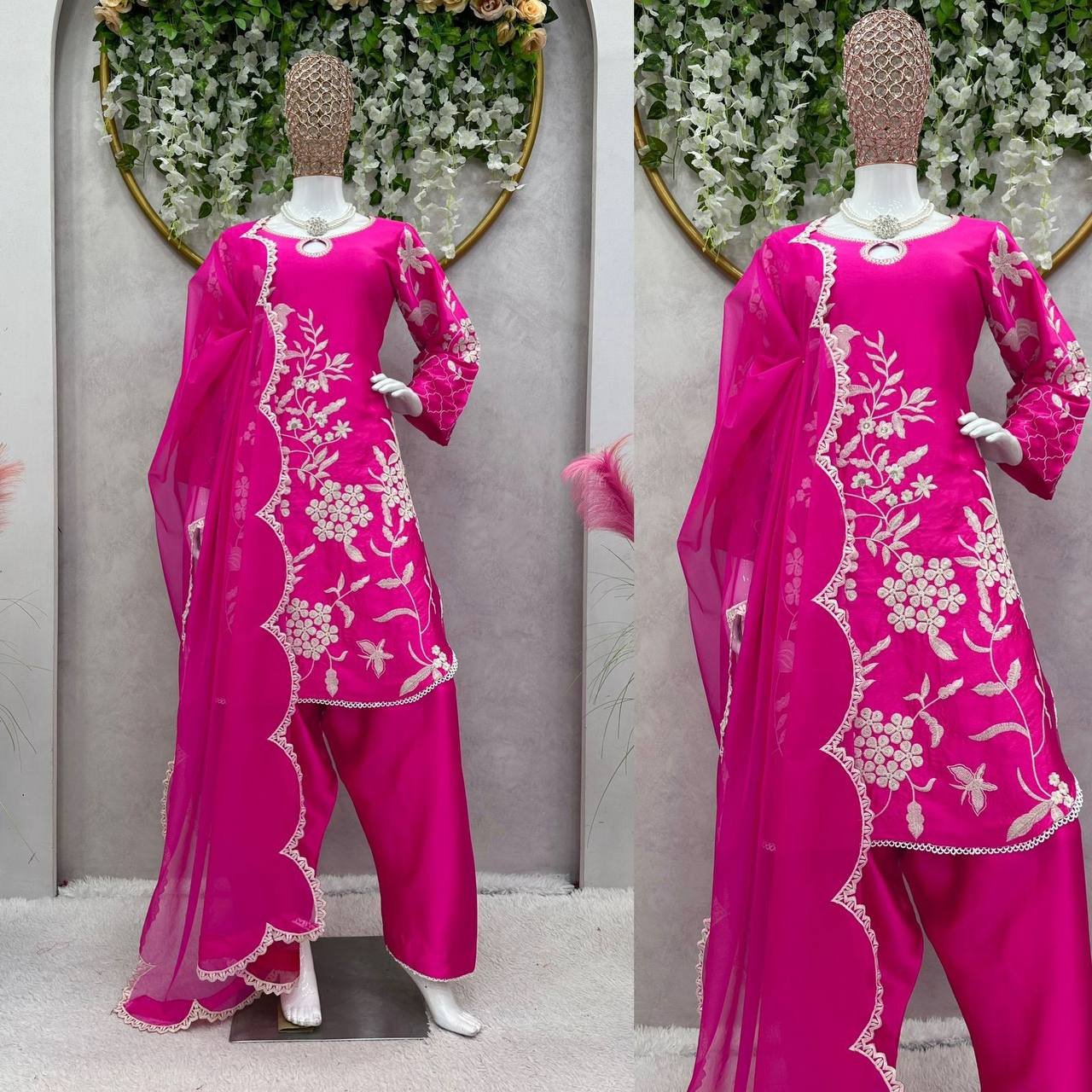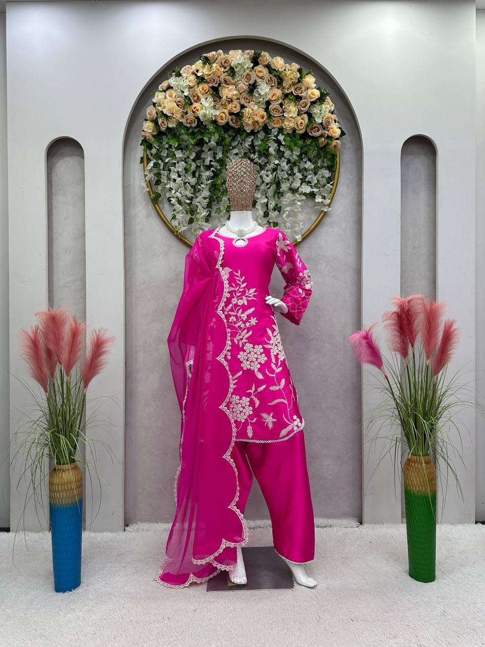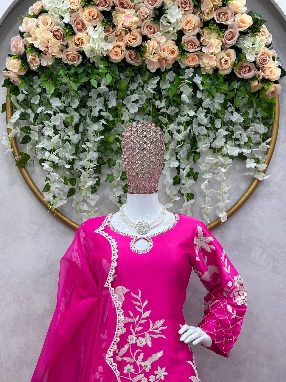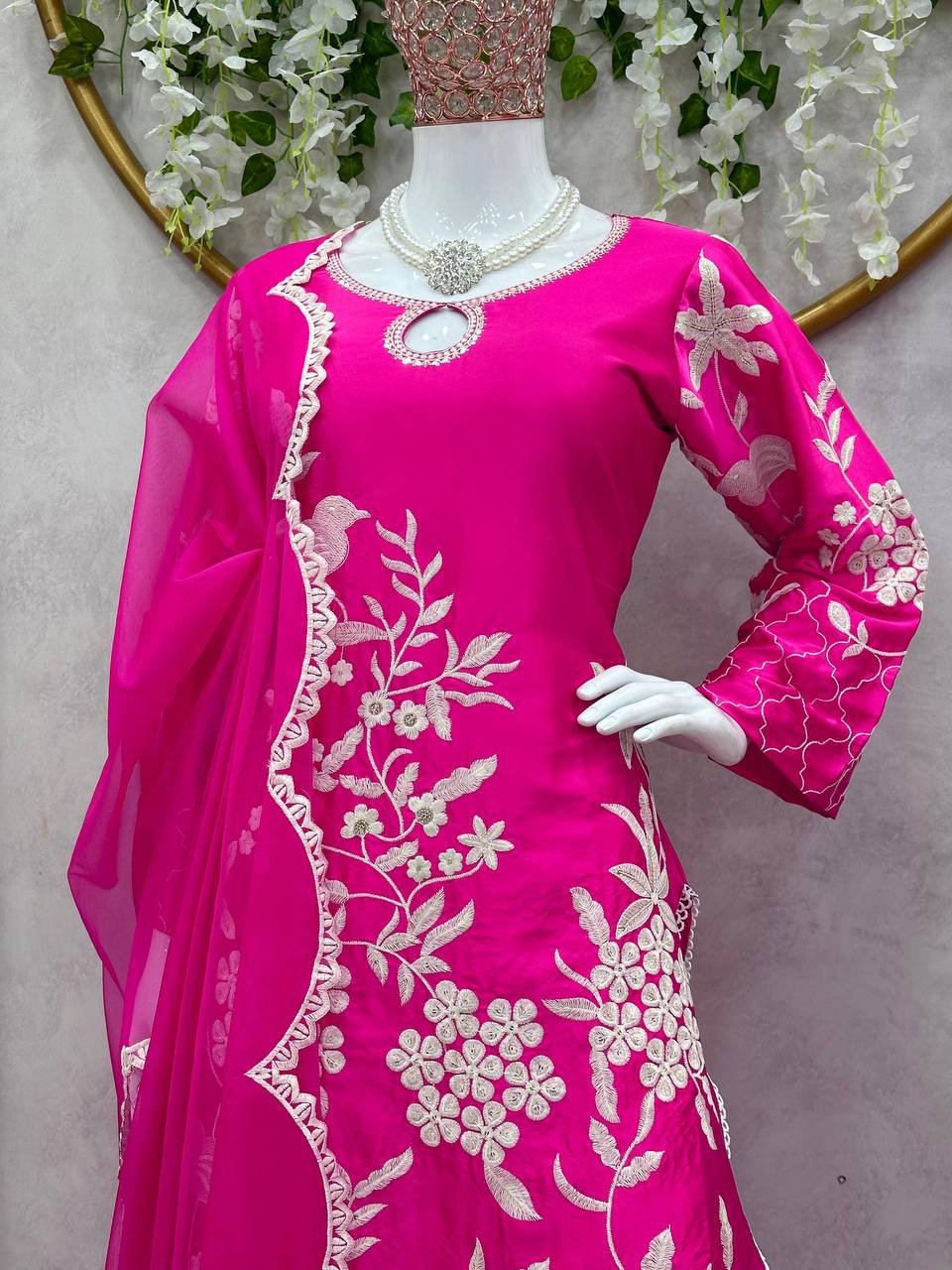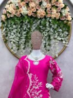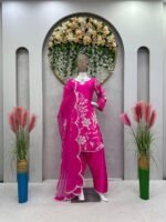 This designer suit set is crafted for women who love traditional elegance with a modern touch. The smooth Japan satin fabric ensures a luxurious feel, while the detailed embroidery enhances its festive appeal. A perfect choice for graceful ethnic styling.