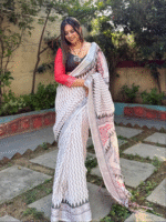 Be the first to review “Elegant White Pure Linen Digital Printed Saree with Chevron Design and Intricate Red-Black Geometric Pallu – Tassel Details and Matching Blouse Piece | Crown Fashion”