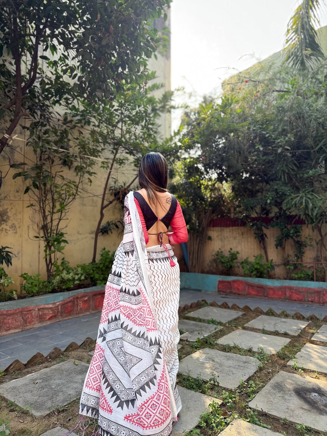 Elegant White Pure Linen Digital Printed Saree with Chevron Design and Intricate Red-Black Geometric Pallu – Tassel Details and Matching Blouse Piece | Crown Fashion