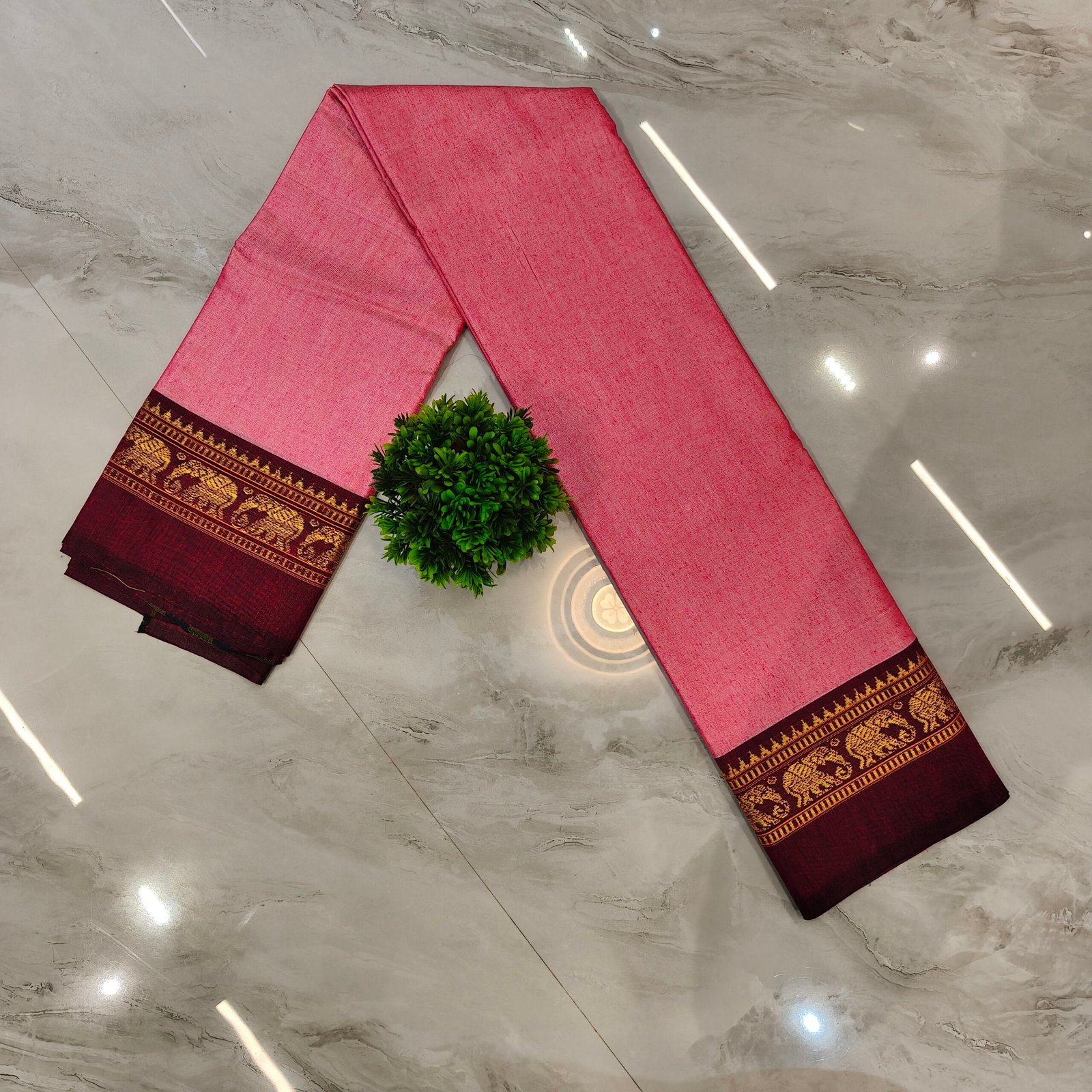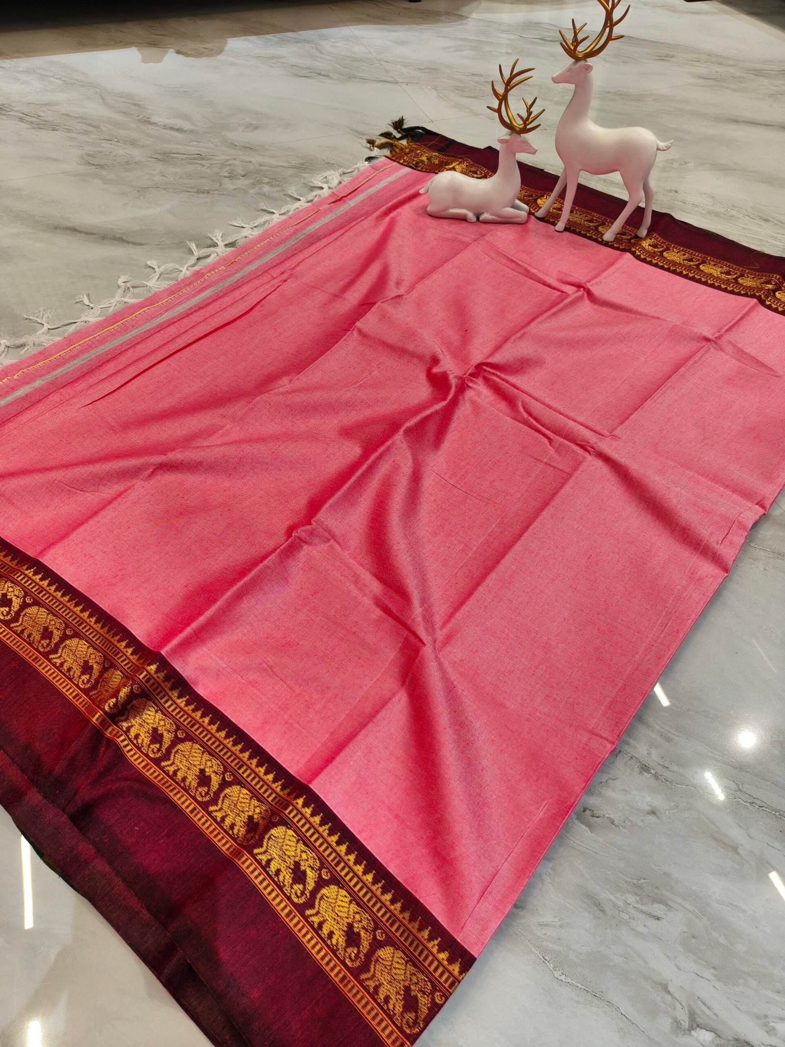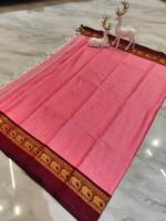 Add a vibrant touch to your ethnic wardrobe with this beautiful rani pink saree paired with a rich maroon zari border. The bright pink shade gives a festive and lively appeal, while the traditional elephant motif border adds elegance and cultural charm. Perfect for weddings, celebrations, and festive occasions.