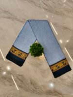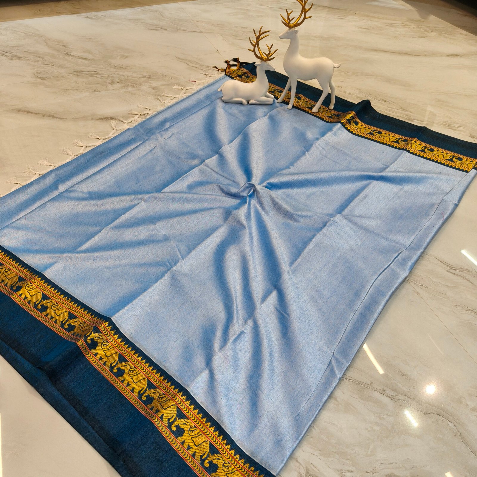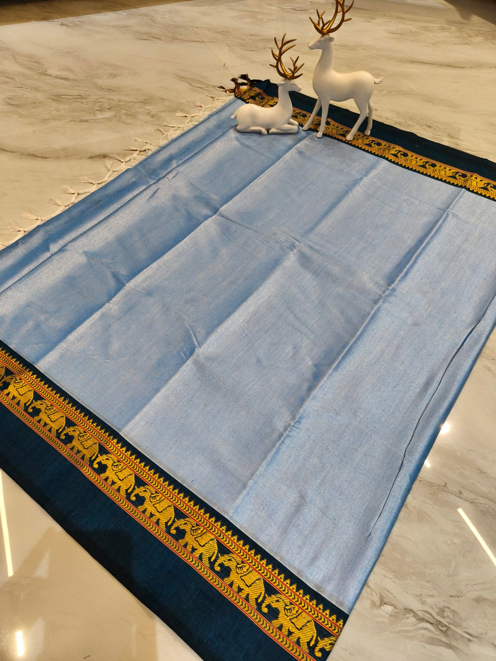 Refresh your ethnic style with this elegant sky blue saree paired with a contrasting dark blue zari border. The soft pastel shade gives a graceful and soothing look, while the traditional elephant motif border adds a touch of heritage charm. Ideal for both daytime events and festive occasions.