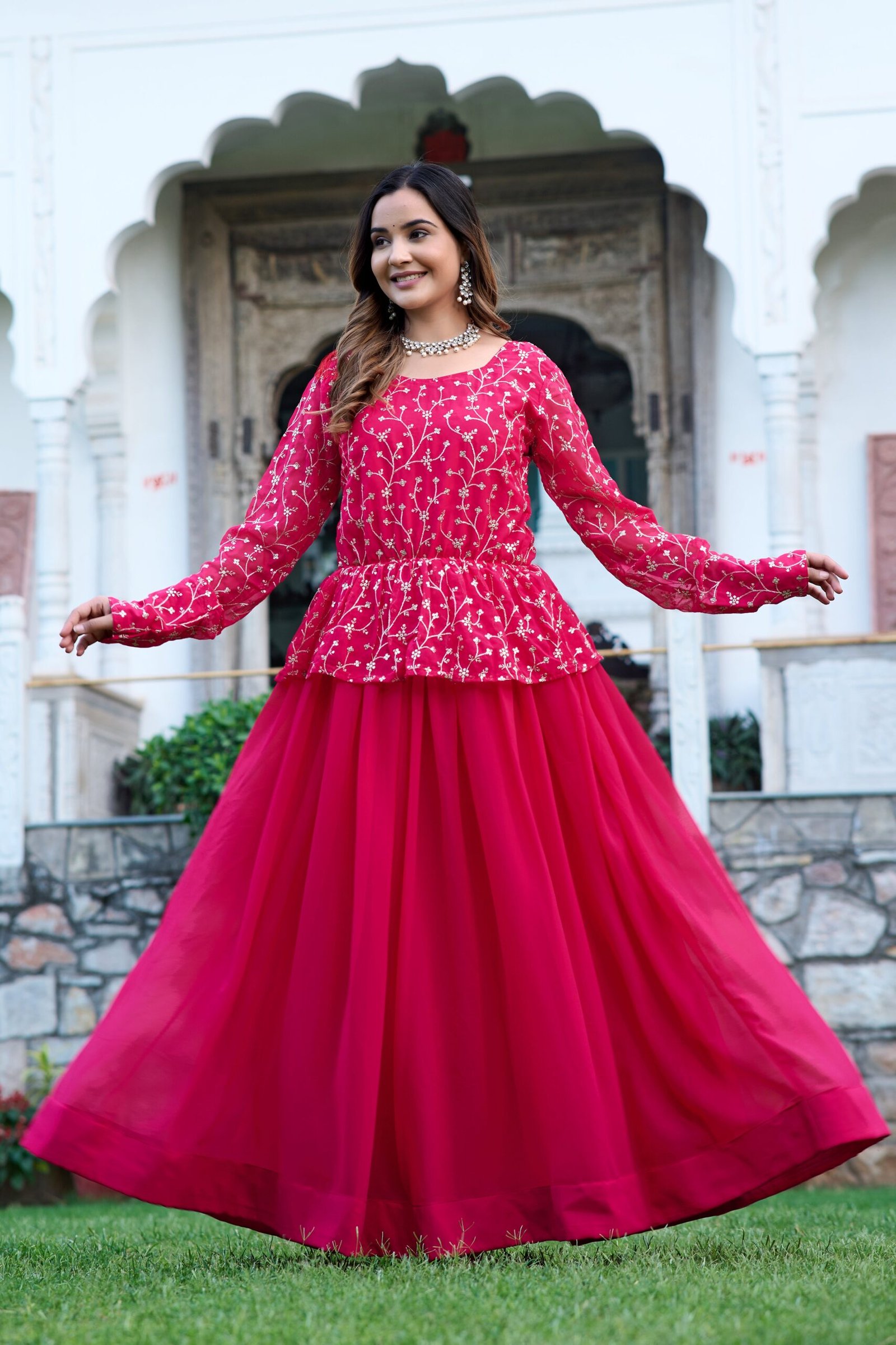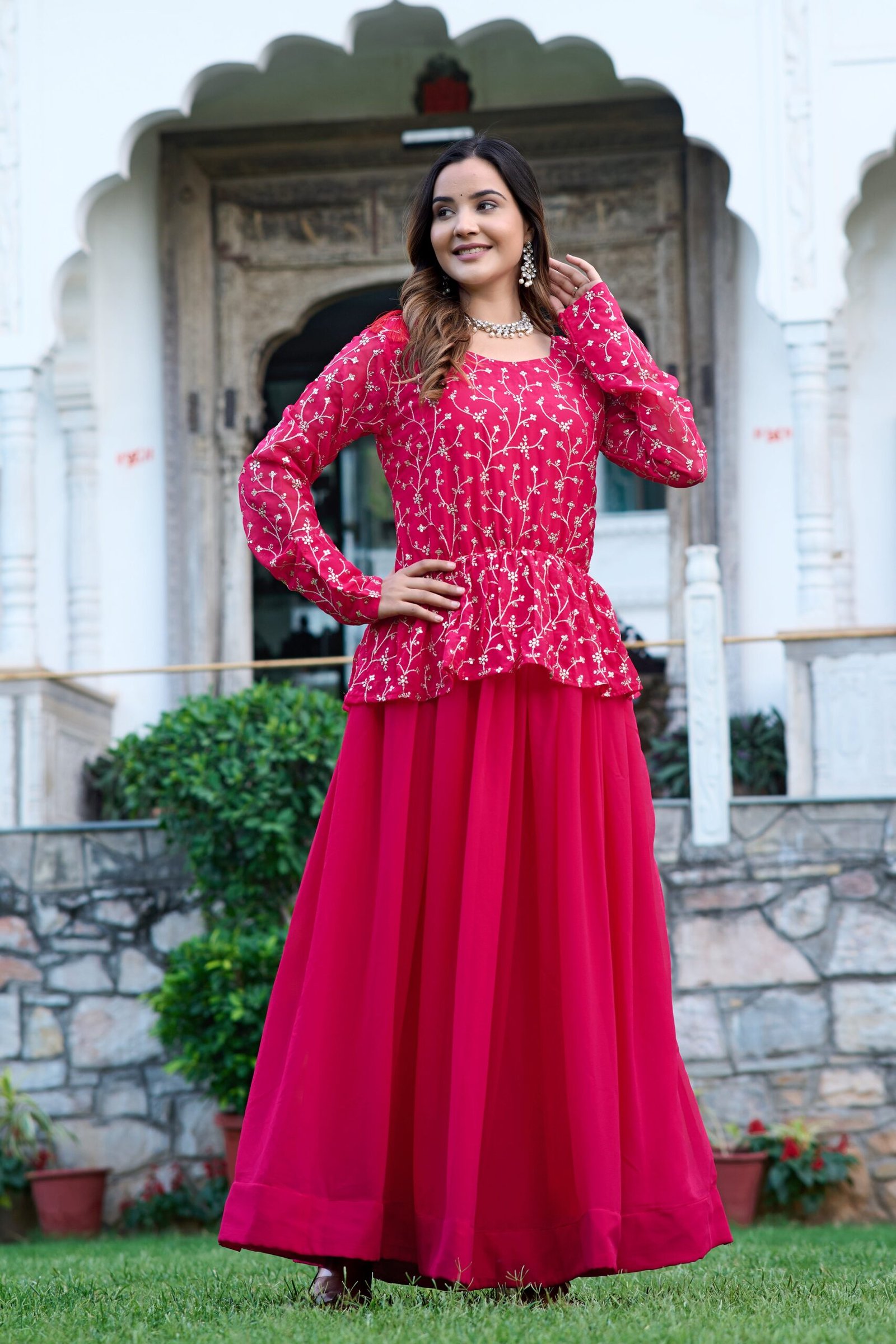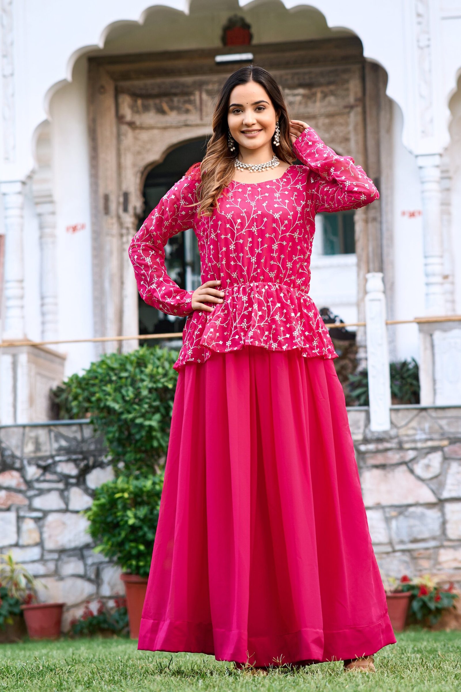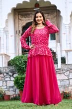 This Anarkali gown is perfect for women who love vibrant ethnic wear with a modern twist. The bright rani pink color adds a festive vibe, while the soft fabric ensures comfort throughout the day. Its elegant design makes it suitable for both day and evening events.