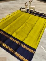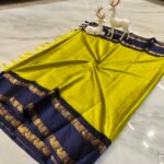 Make a bold ethnic statement with this mustard yellow saree paired with a rich navy blue zari border. The vibrant body color combined with the elegant gold woven border creates a striking and festive-ready look.
