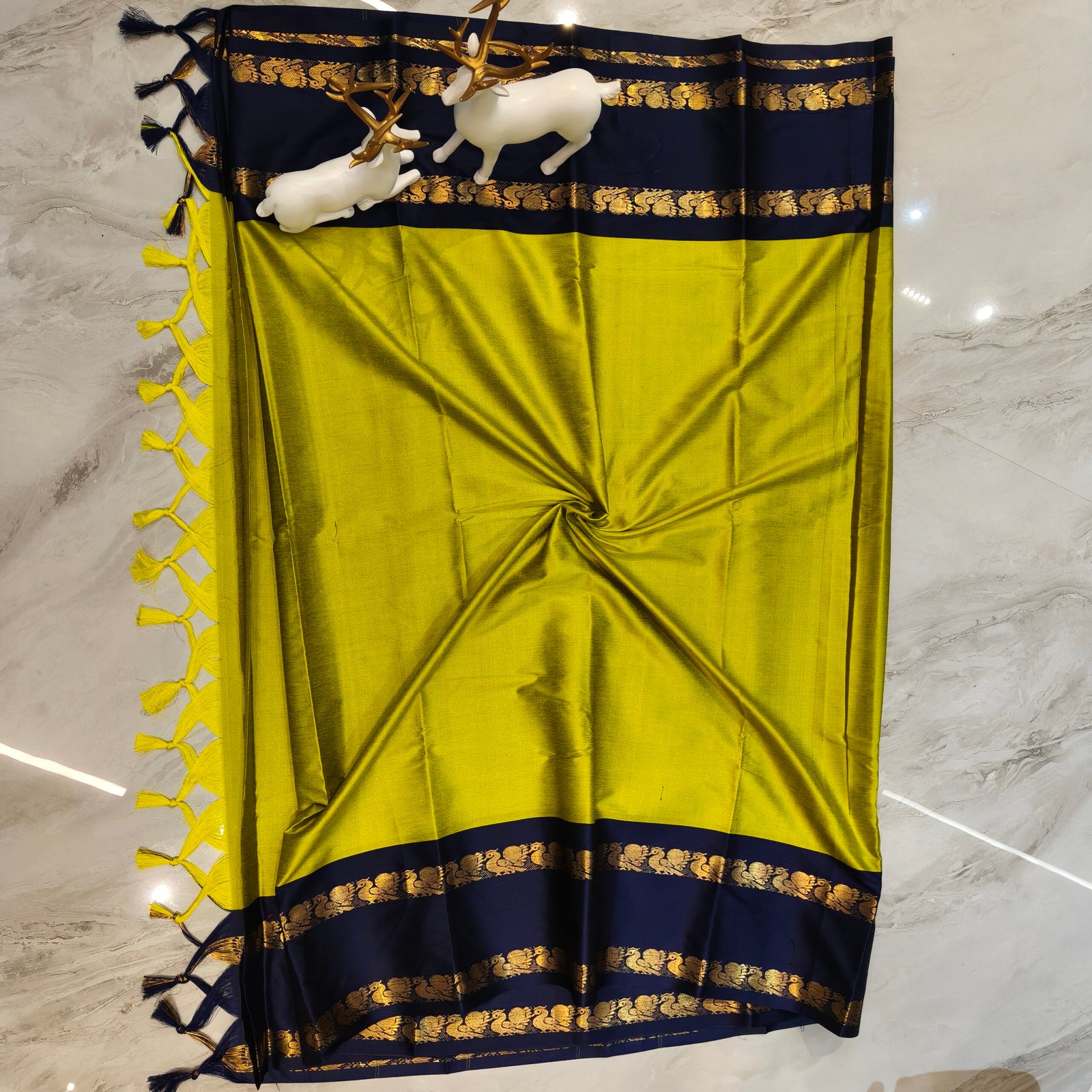 - Bright mustard yellow saree with navy blue contrast border