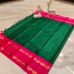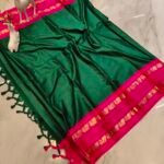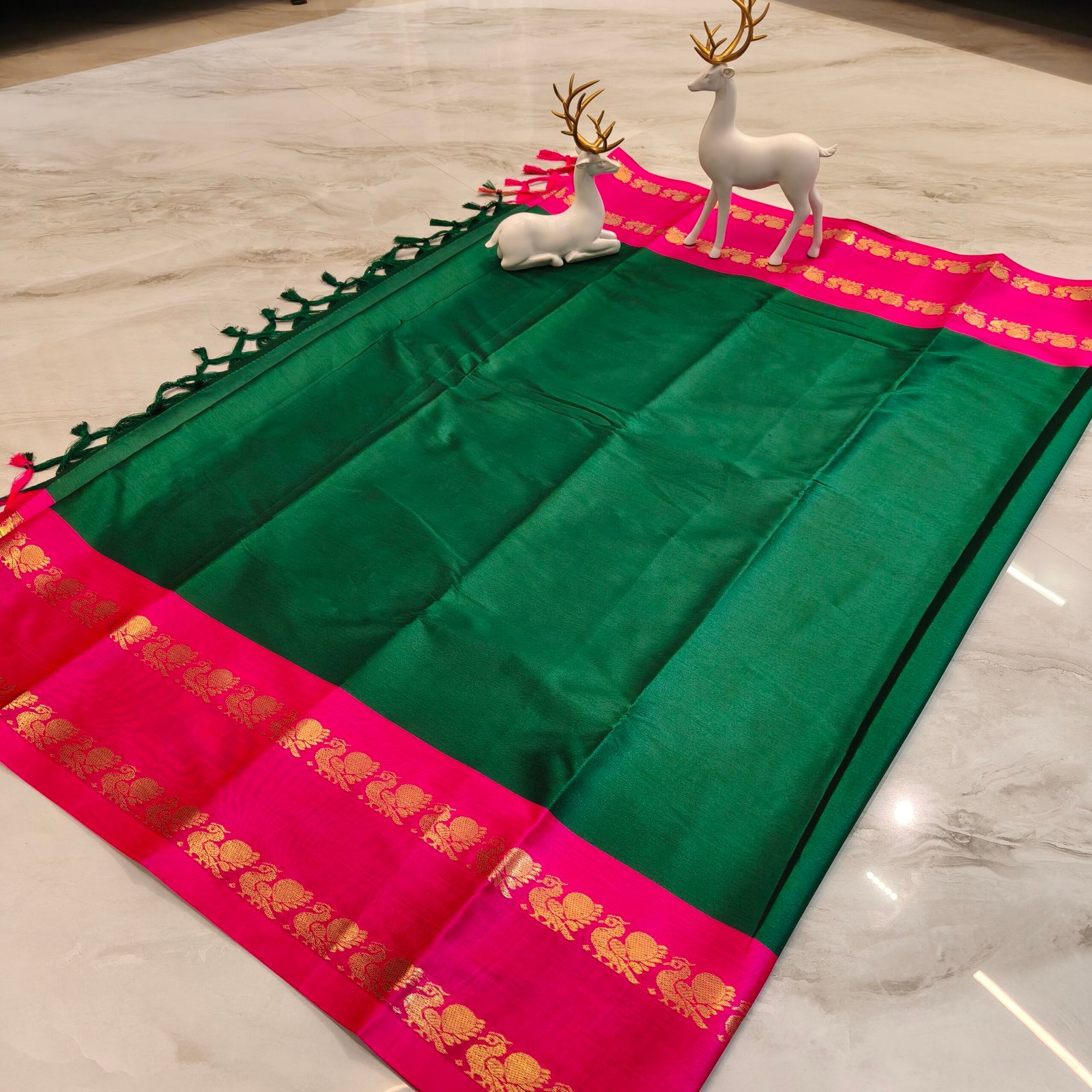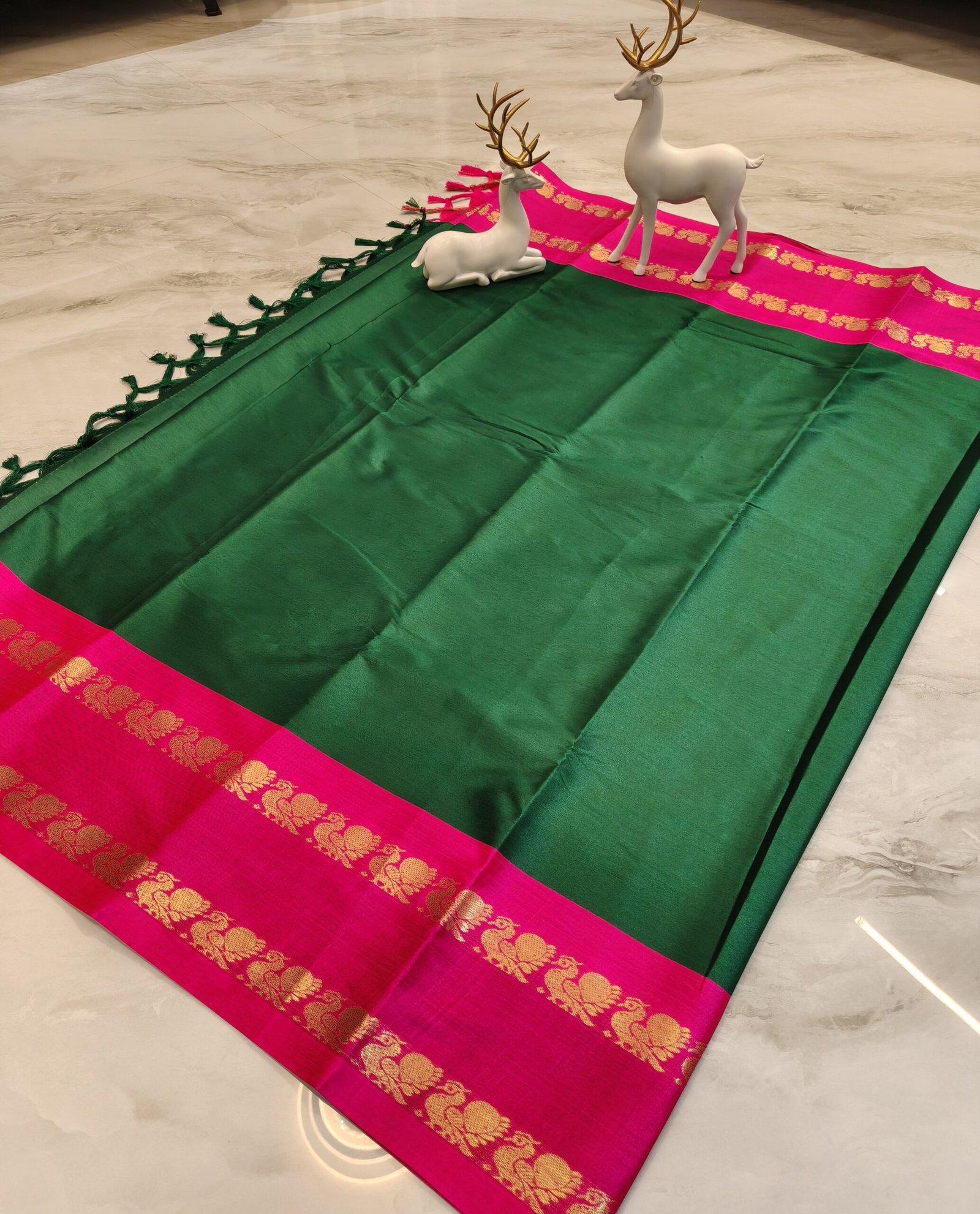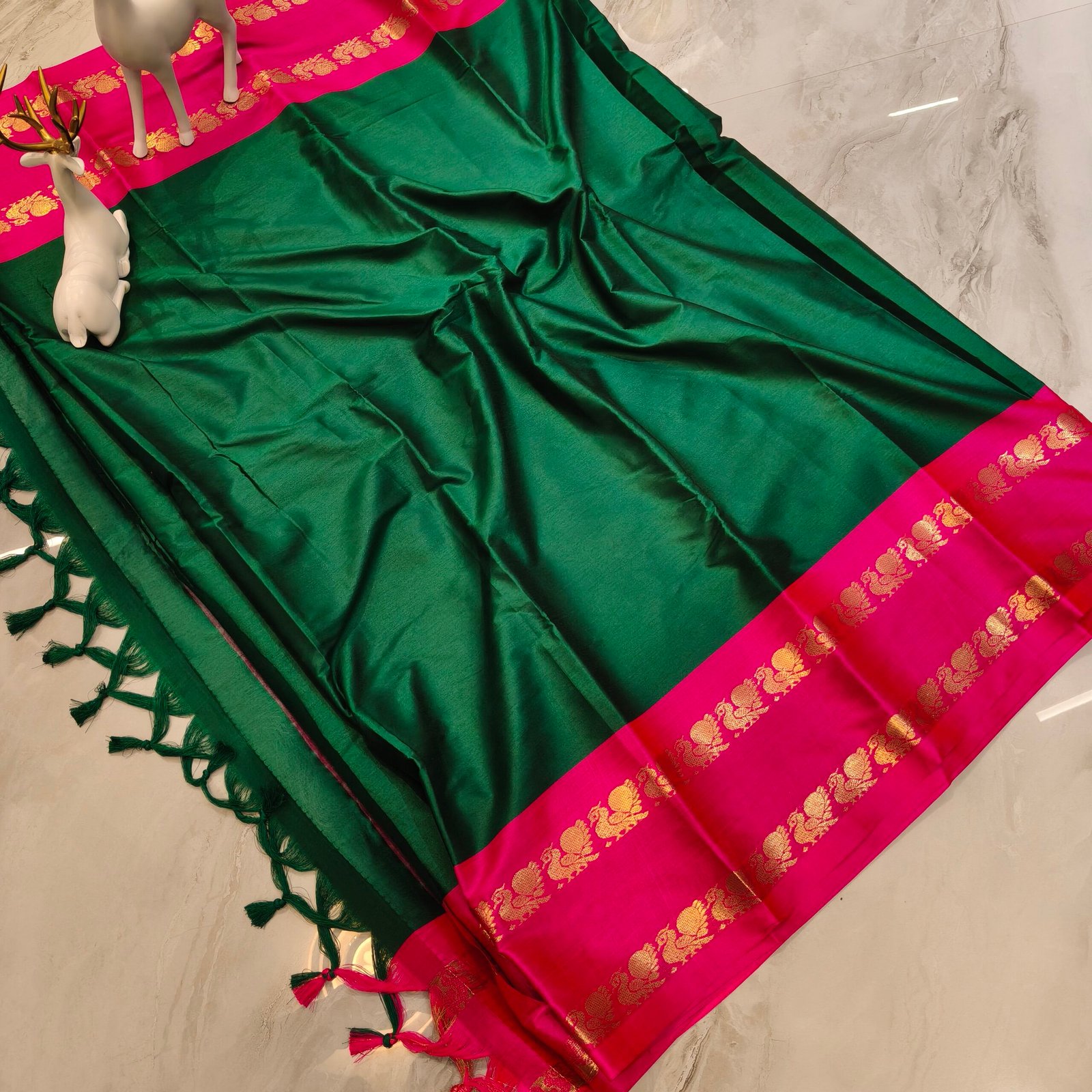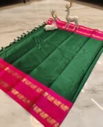 Enhance your ethnic collection with this rich bottle green saree paired with a vibrant rani pink zari border. The bold color contrast combined with traditional golden weaving creates a stunning festive look.