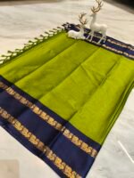Add elegance to your ethnic wardrobe with this mehendi green saree paired with a rich navy blue zari border. The earthy green tone combined with the bold blue contrast gives a graceful and sophisticated festive look.