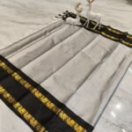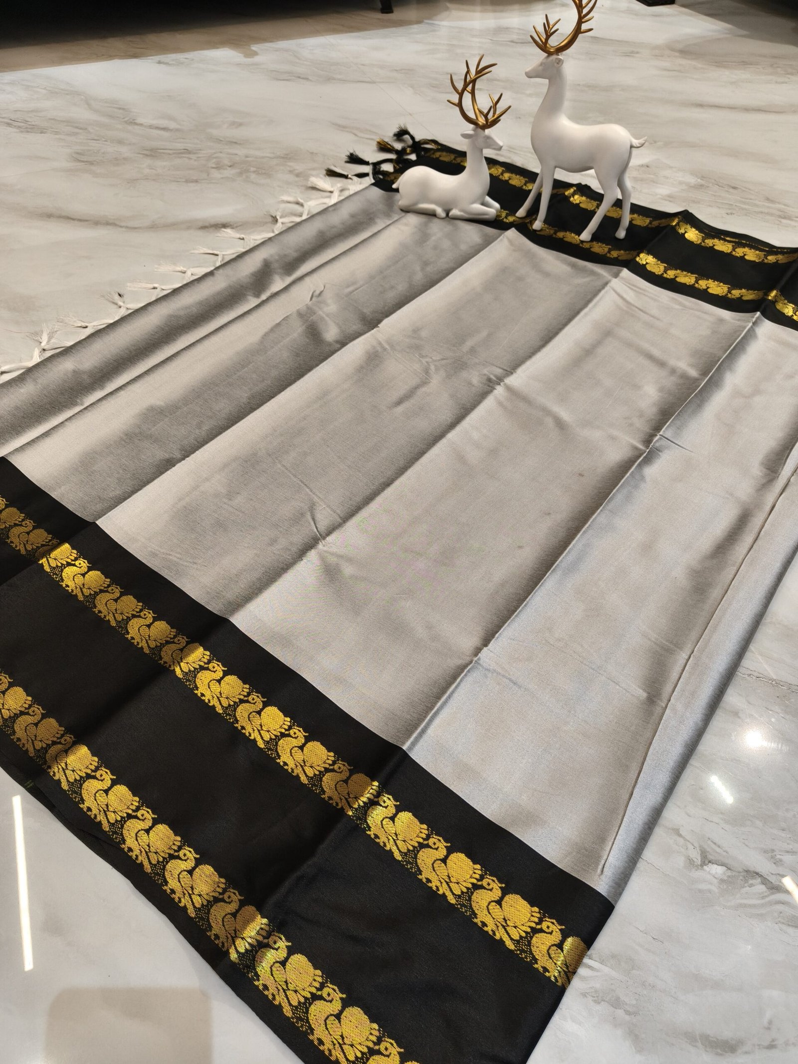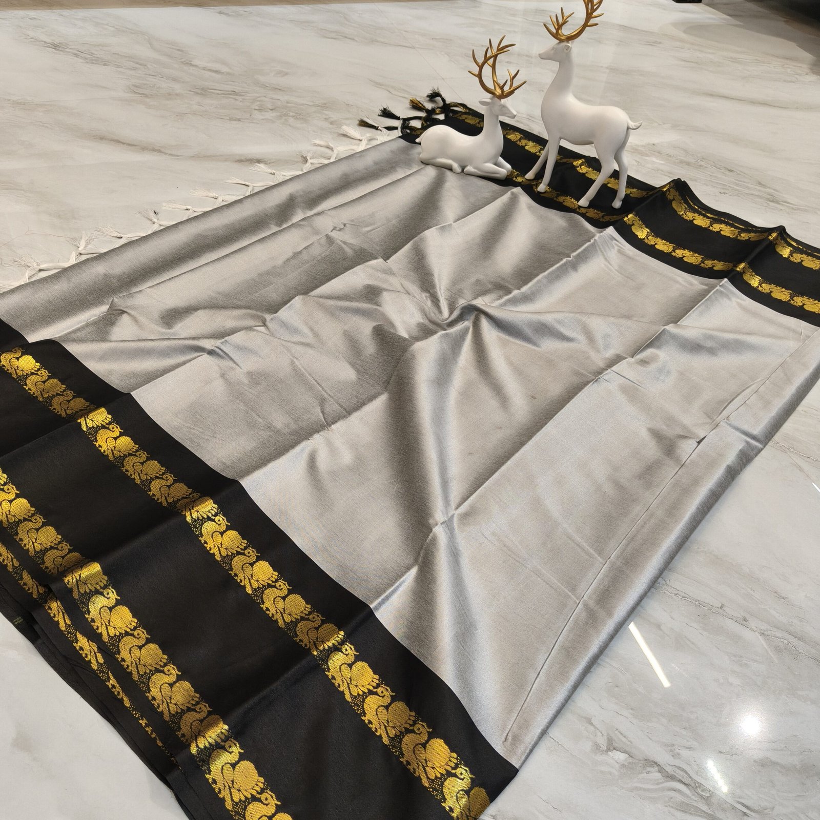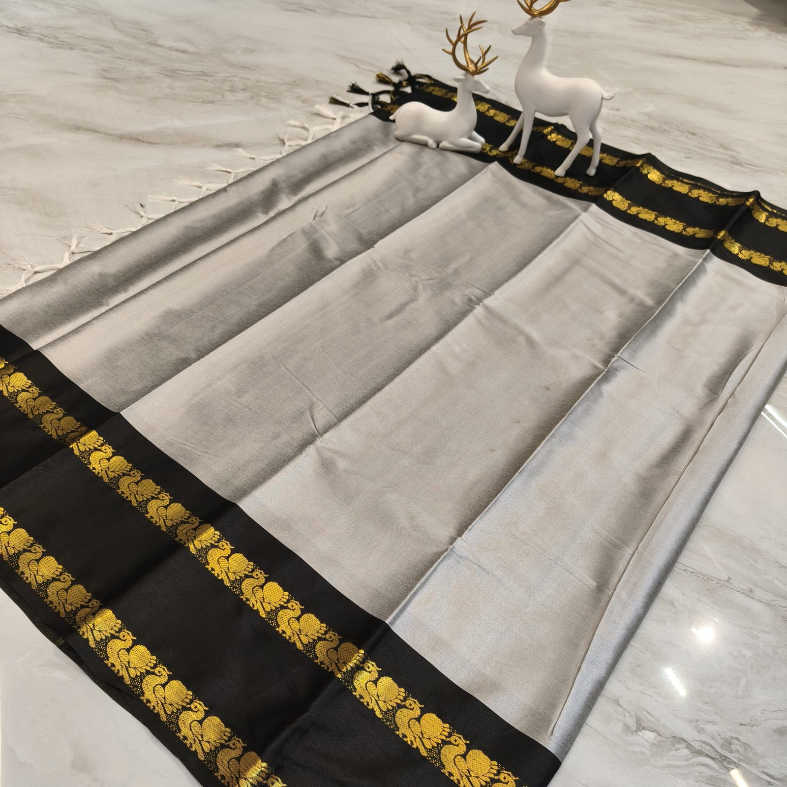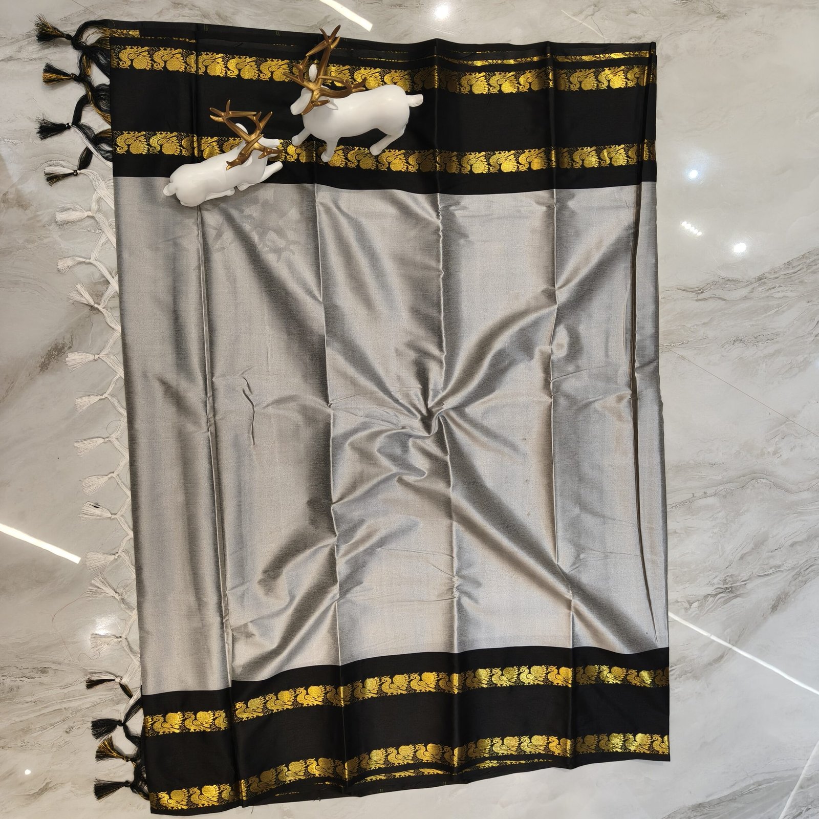Elevate your ethnic style with this graceful silver grey saree paired with a bold black zari border. The subtle shimmer of the fabric combined with the rich contrast border creates a sophisticated and timeless look.